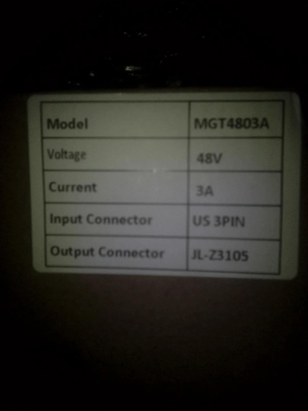 This is a New MGT4803A power charger. It operates at 48V and has a 3A current rating. The input connector is US 3PIN. It's designed for charging devices that require these specifications.