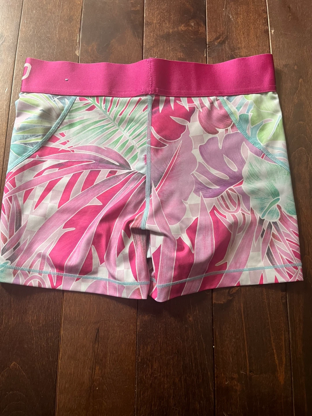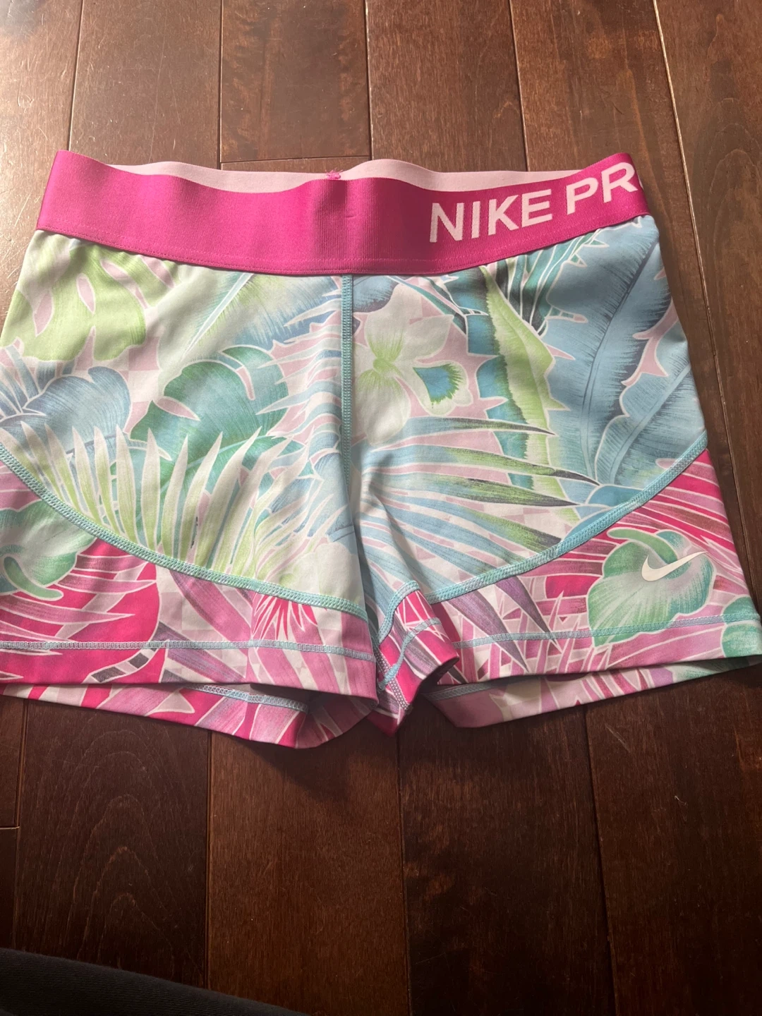 Nike Pro Dri-FIT athletic shorts in a vibrant tropical print. These shorts are size large.