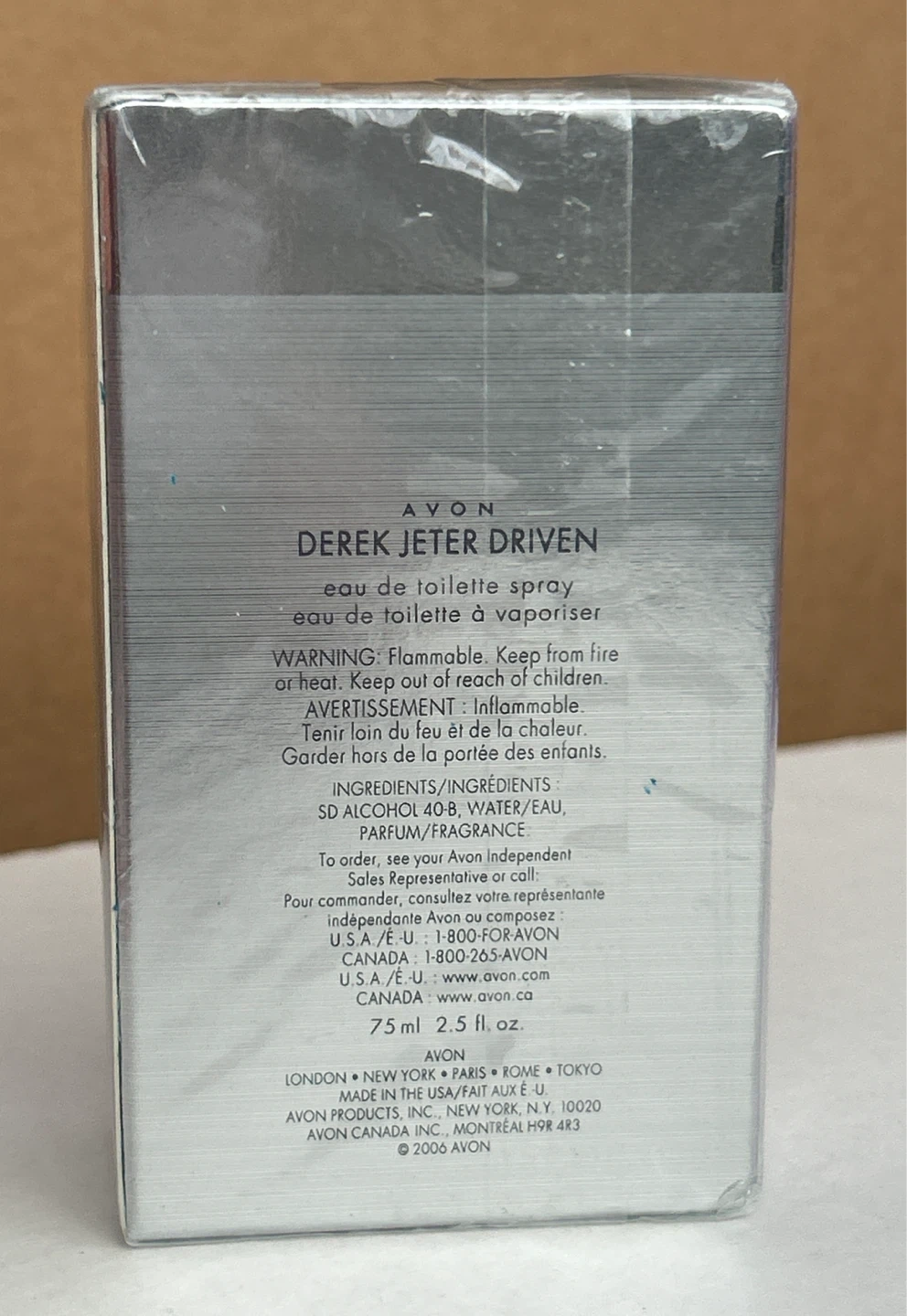 This is a new, sealed bottle of Avon Derek Jeter Driven eau de toilette spray. It's a 75 ml (2.5 fl. oz.) size. The scent is a parfum/fragrance blend.