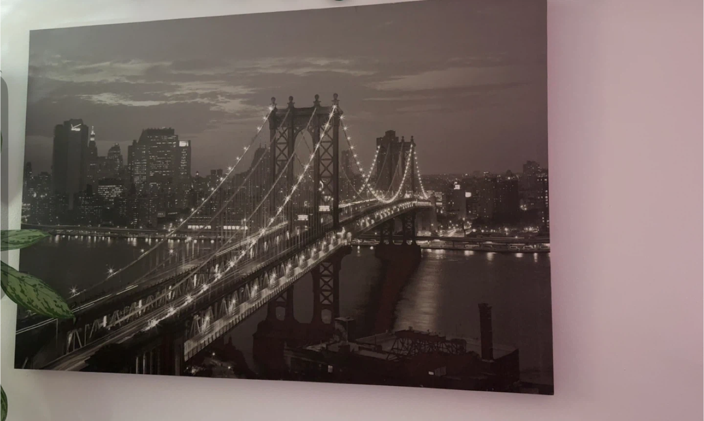This canvas wall art features a black and white photograph of a city skyline with a bridge illuminated by lights. It's a great piece to add to your home decor. The print is on canvas.