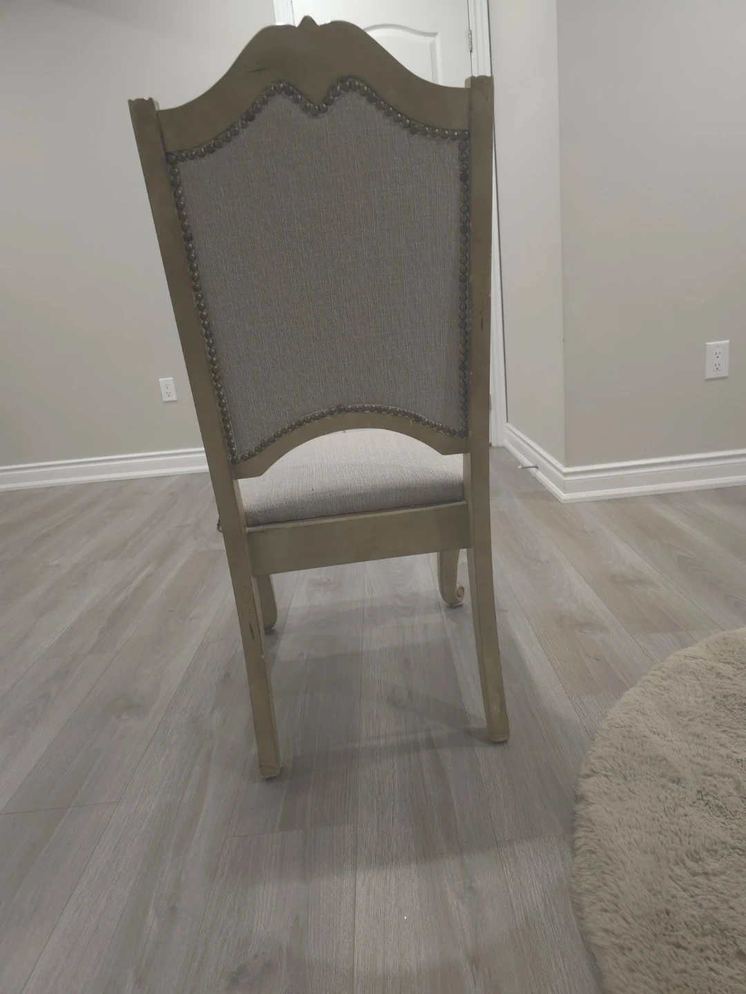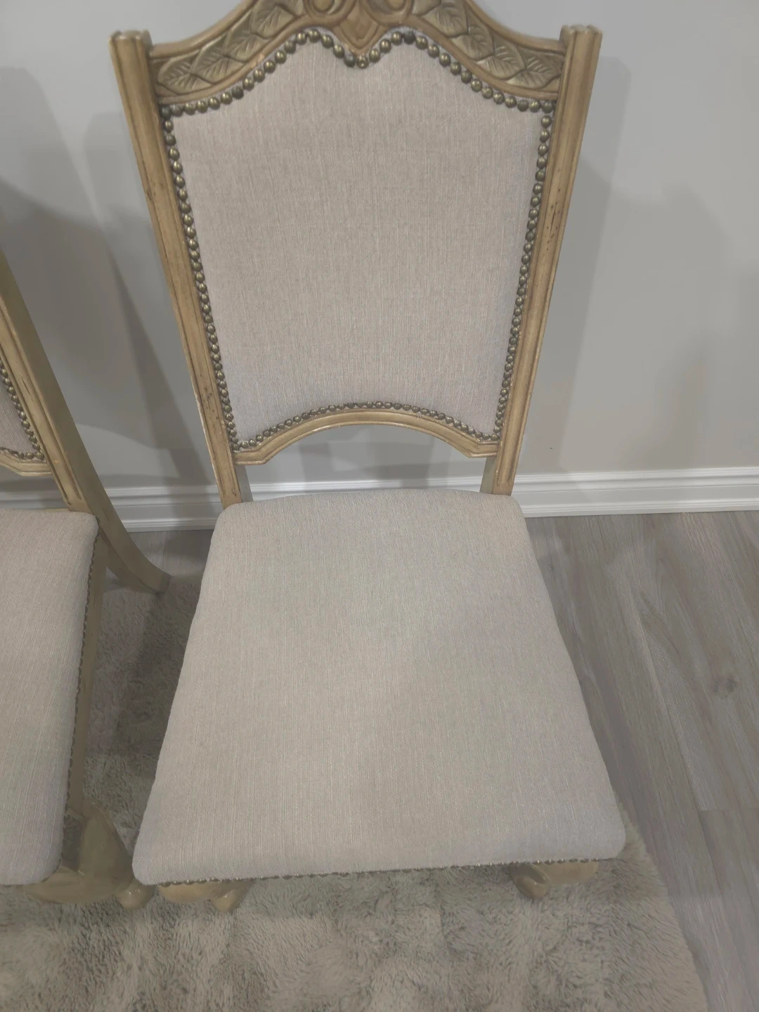 These five dining/breakfast chairs feature a classic design with upholstered seats and backs. They have decorative nailhead trim and ornate carved wooden frames. They're perfect for adding a touch of sophistication to your dining room, breakfast set, or any seating area.