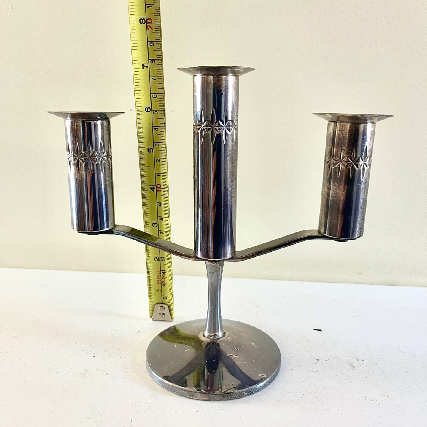 Mid century Atomic Starburst Primrose Plate silver plated candelabra. Good vintage condition.