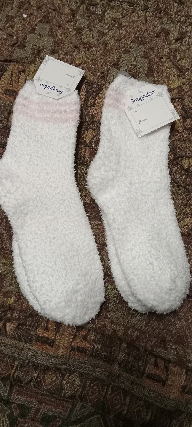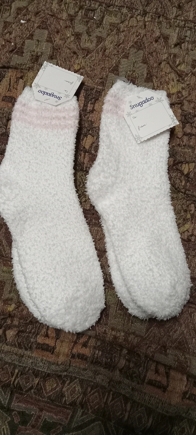 pair of super soft and cozy Snugadoo socks! They're brand new with tags, perfect for keeping your feet warm and comfy. The socks are white and have a fuzzy texture. Great for lounging around the house!