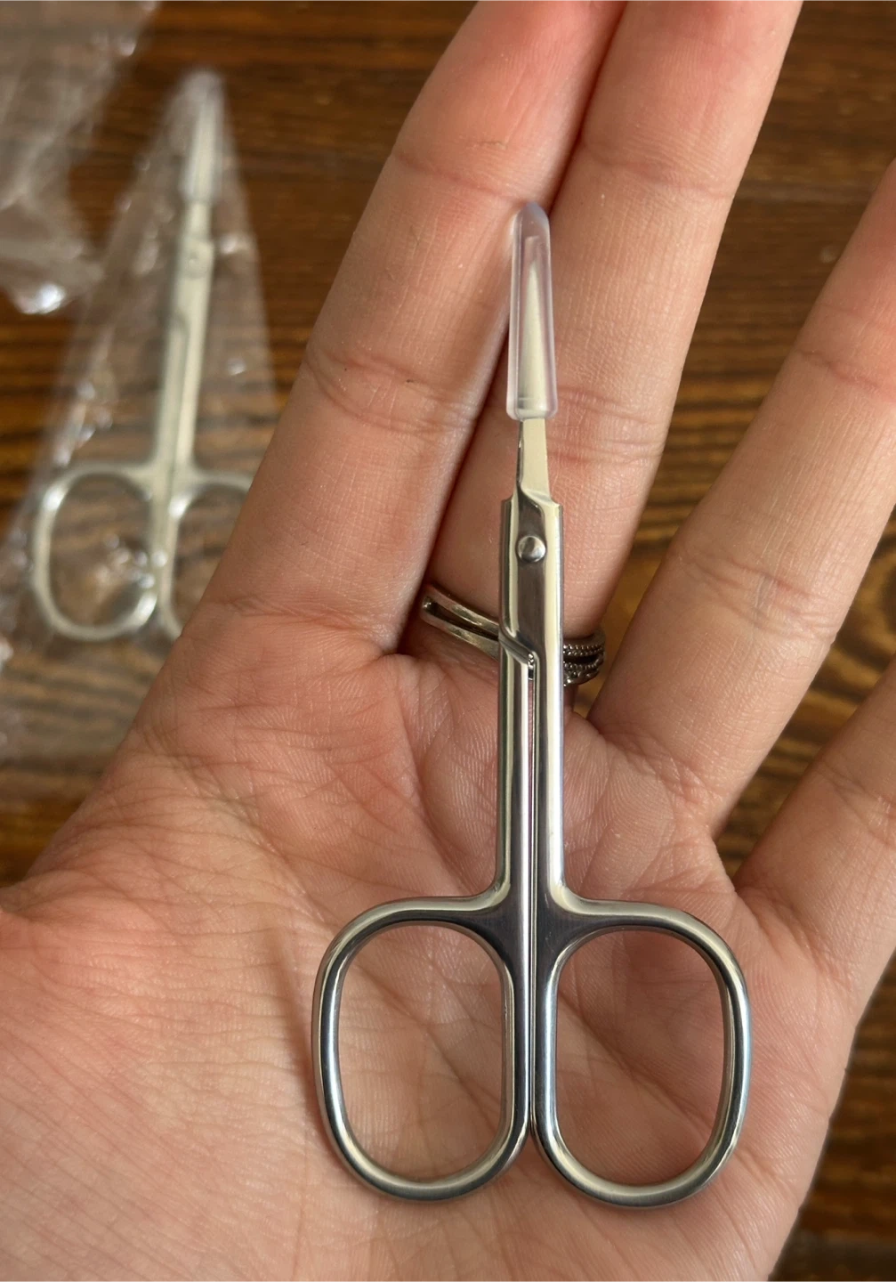 This is a pair of small grooming scissors, perfect for detail work. Made of stainless steel, they come with a protective cap for the tip. They're handy for trimming nails or other precise grooming tasks.