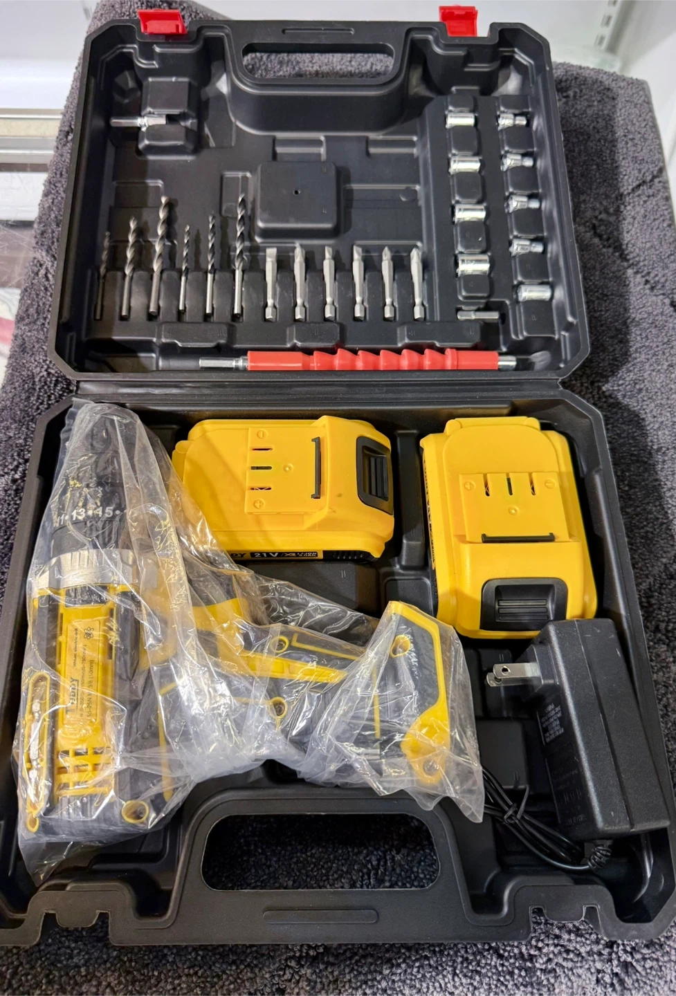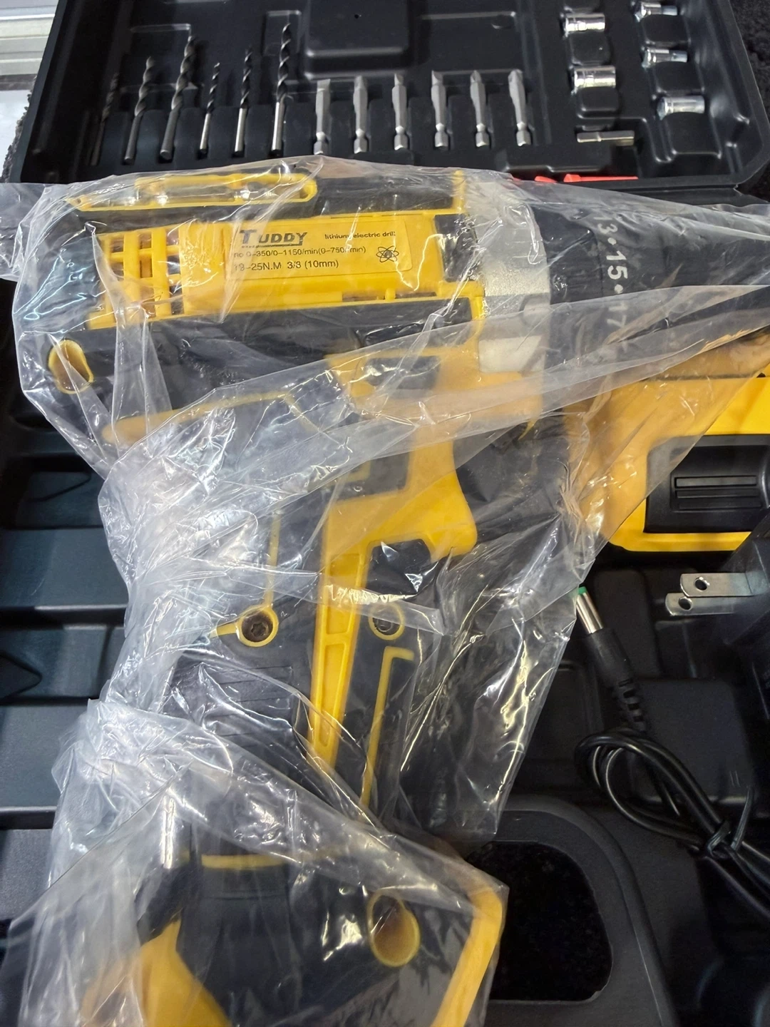 This Tuddy cordless electric drill comes with two batteries and a charger. It includes a variety of drill bits and socket attachments in a durable carrying case. Variable speed up to 1150 RPM.