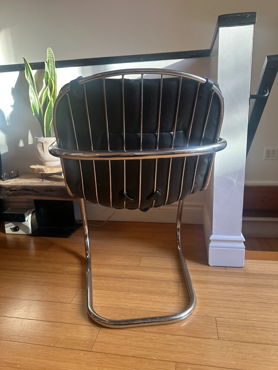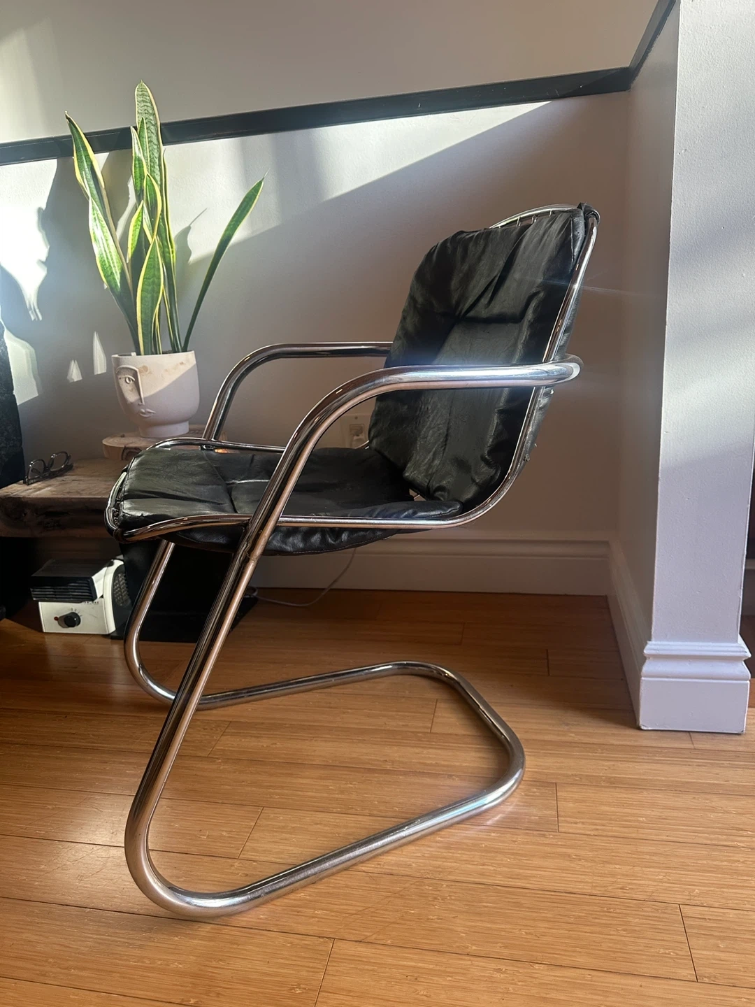 A beautiful mcm cantilever chrome chair. Black leather pad seat. Excellent condition minimal signs of wear.