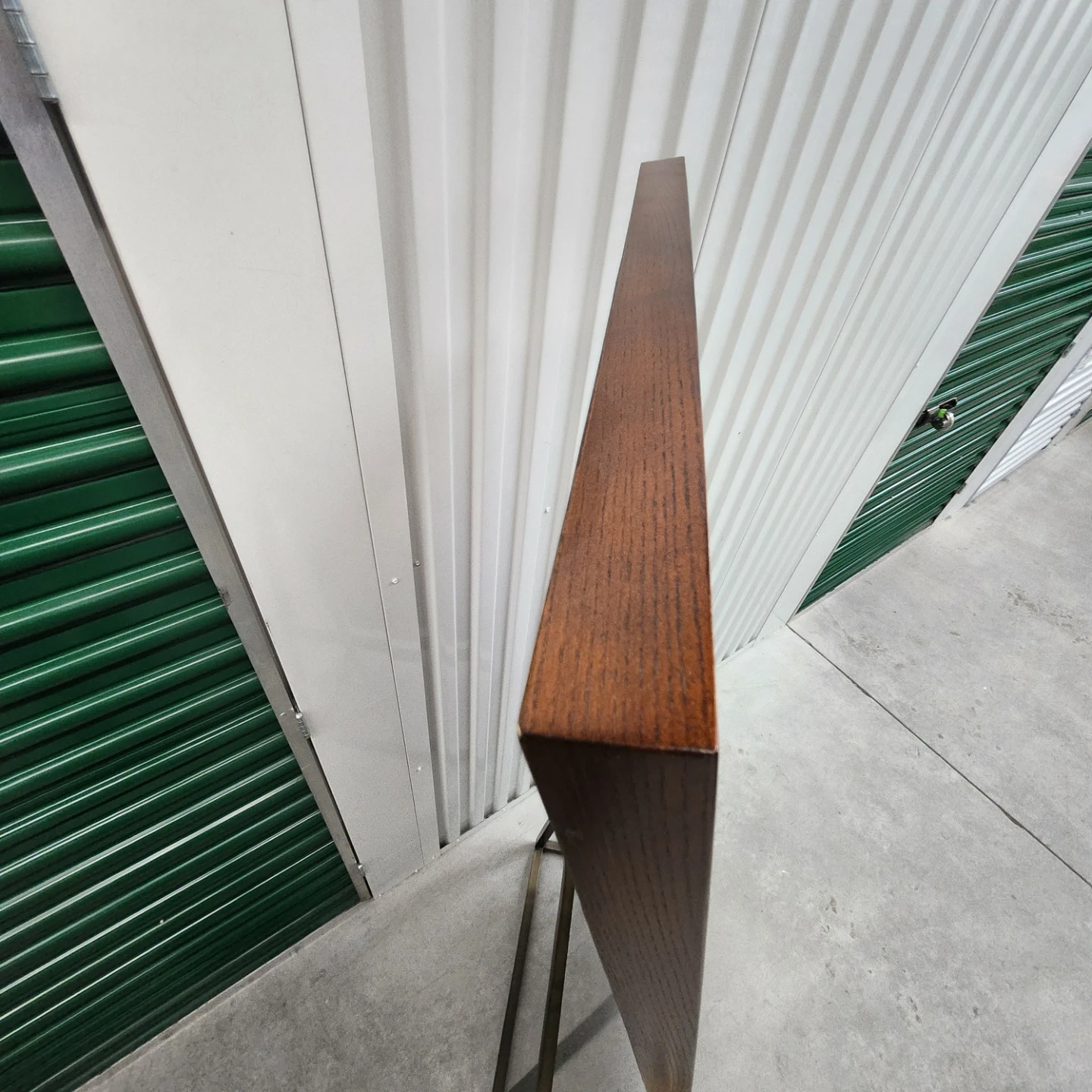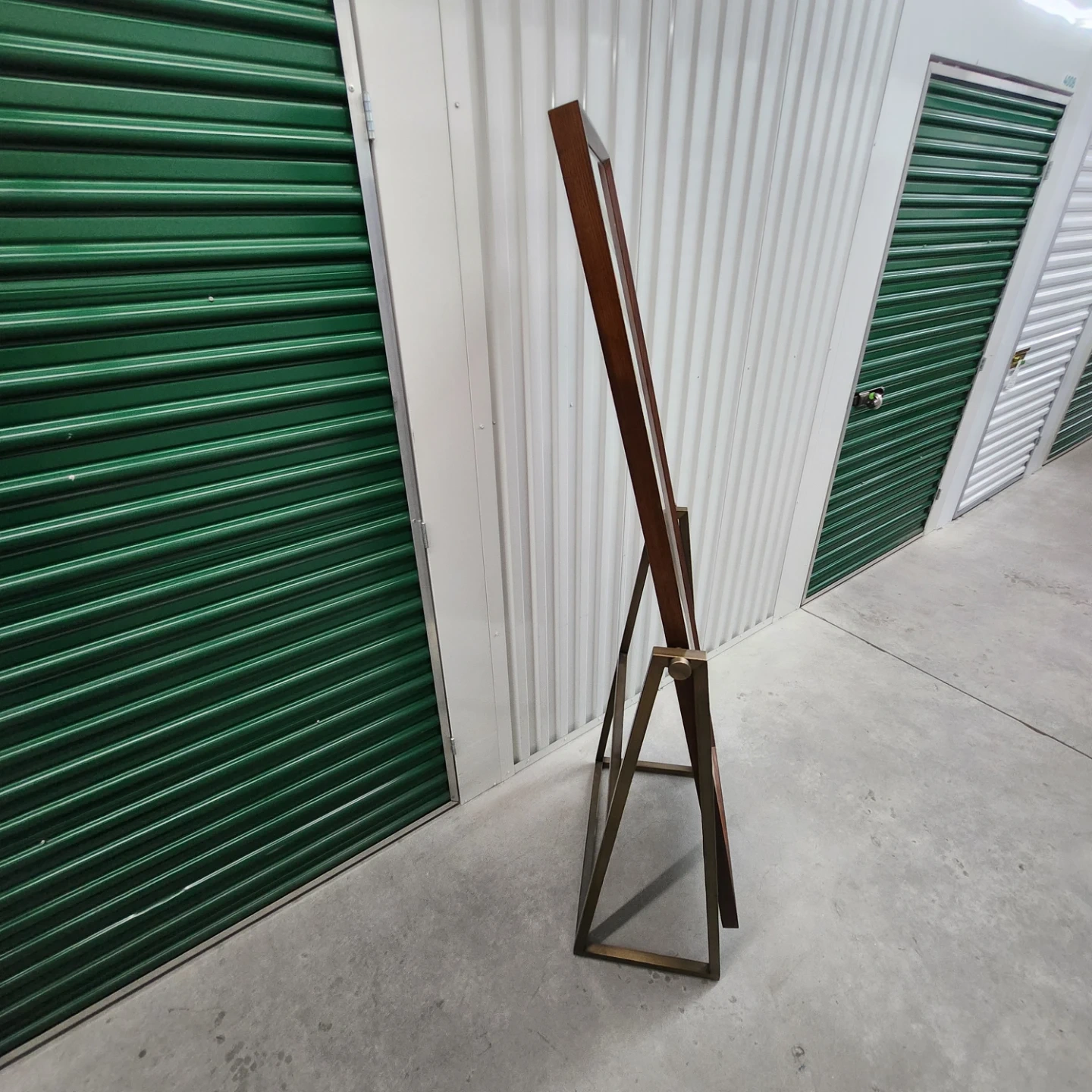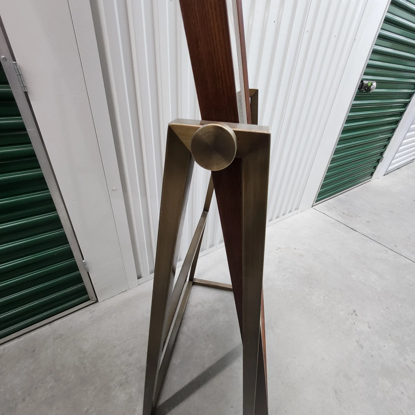 This is a freestanding floor mirror with a wood frame and metal base. It's a stylish accent piece for any room. Adjust mirror position with side knobs.