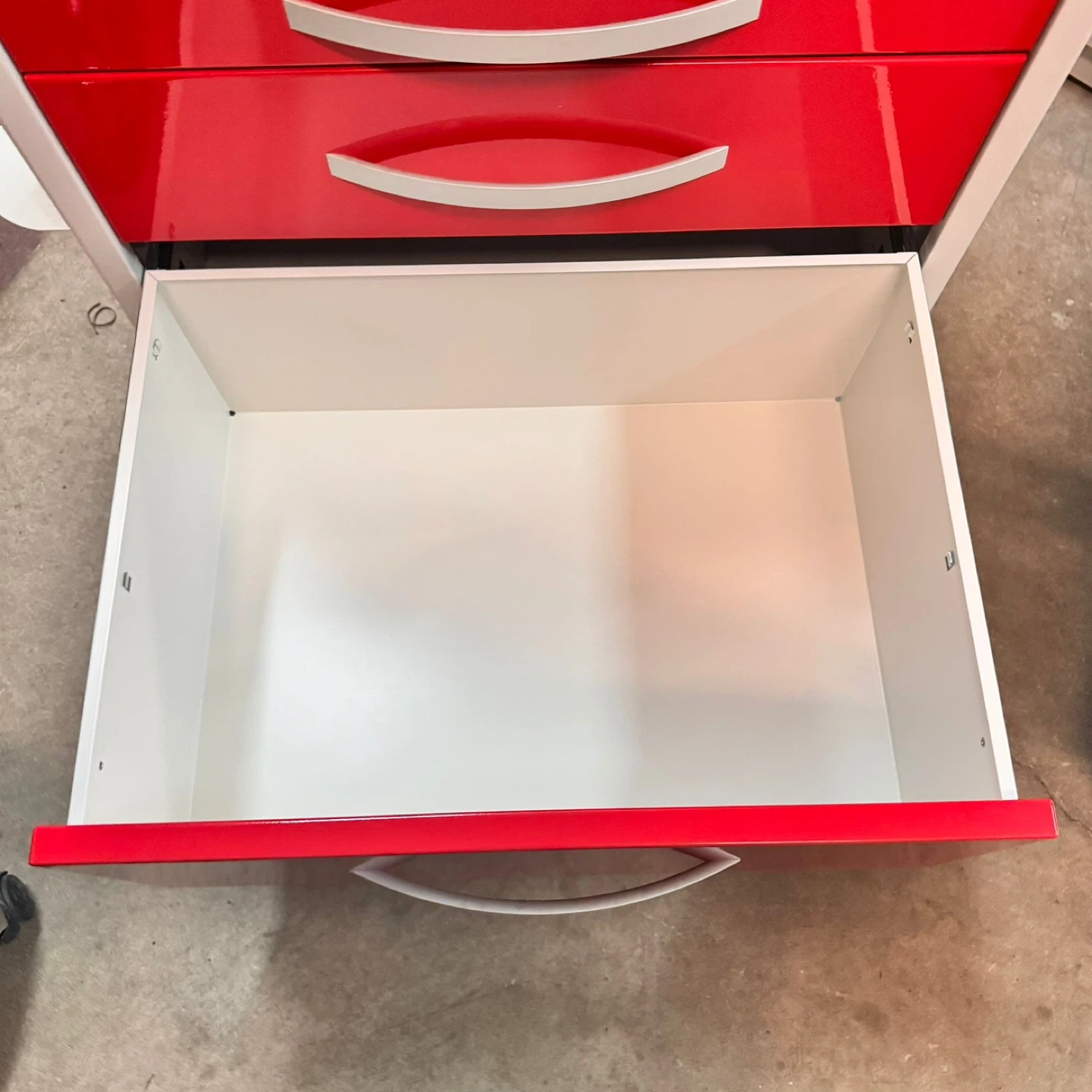 β’ Rugged white frame with 5 deep red drawers