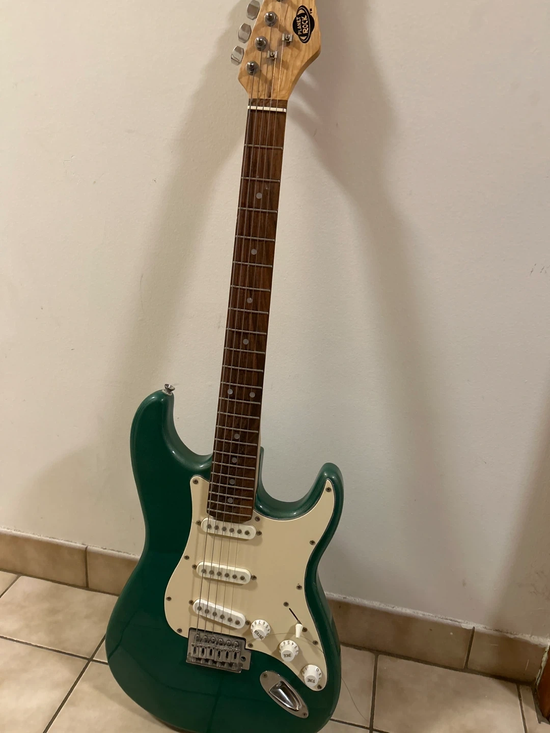 This is a green Planet Rock electric guitar. It has a standard pickup configuration and control knobs. This guitar is great for learning or casual playing.