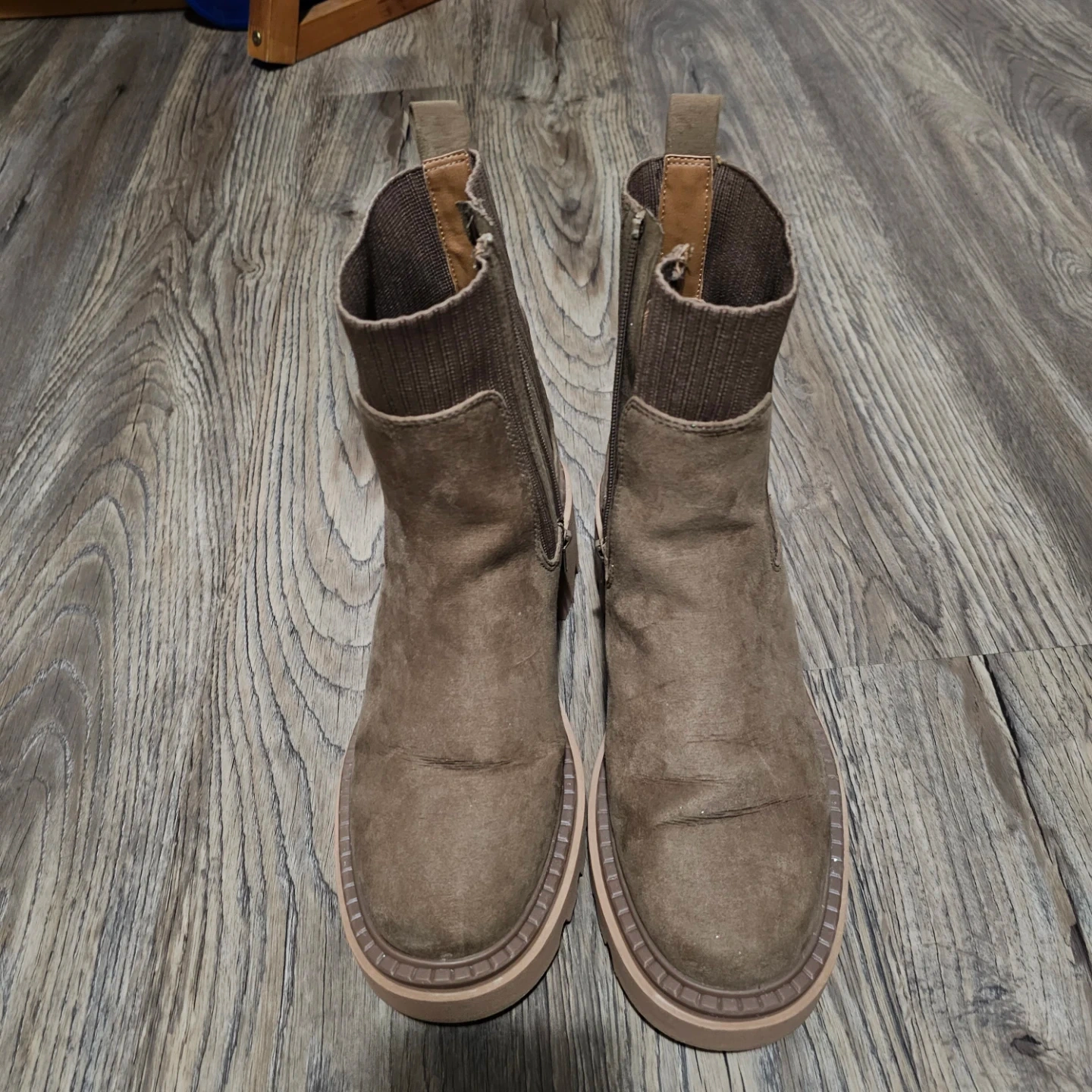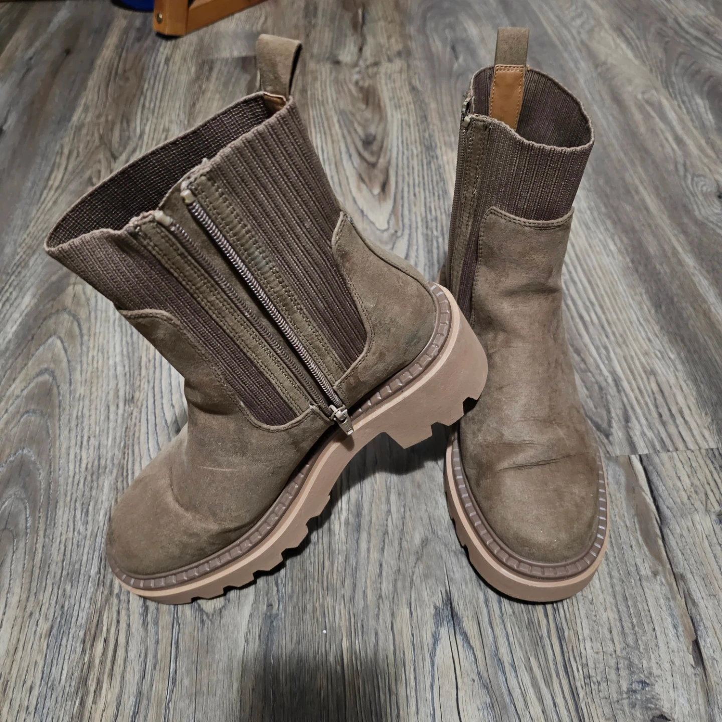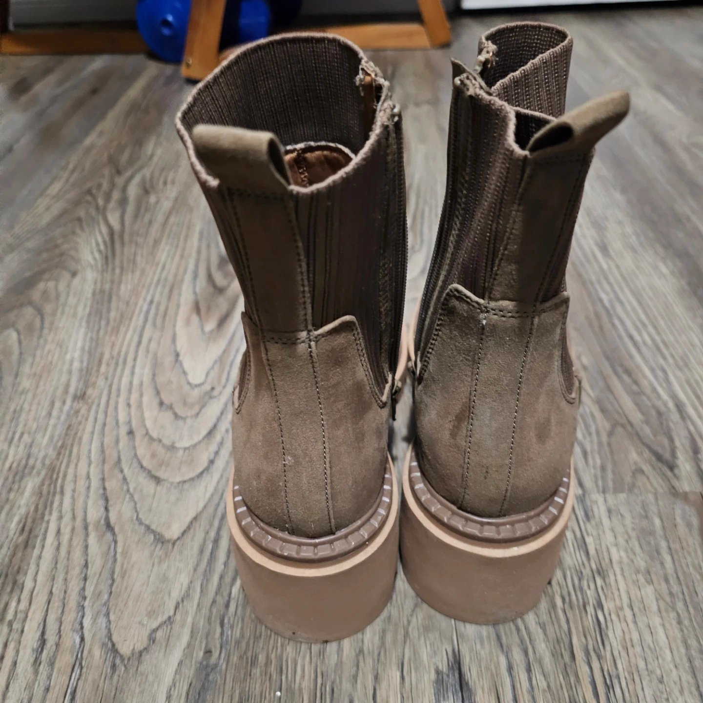 Pair of brown suede chelsea boots. Features elastic side panels and a full-length zipper for easy on and off. Chunky lug sole for added traction. Perfect for everyday wear.