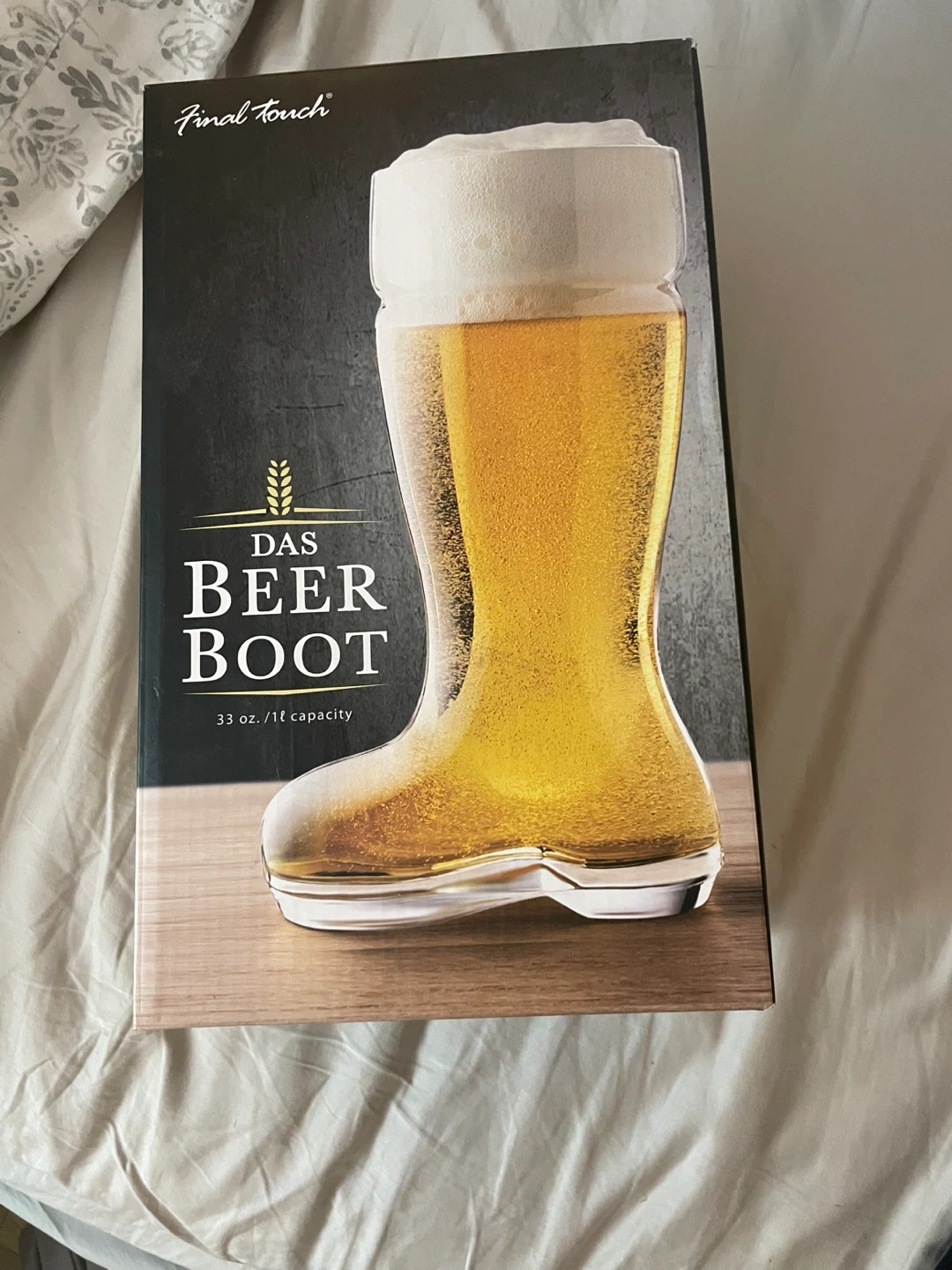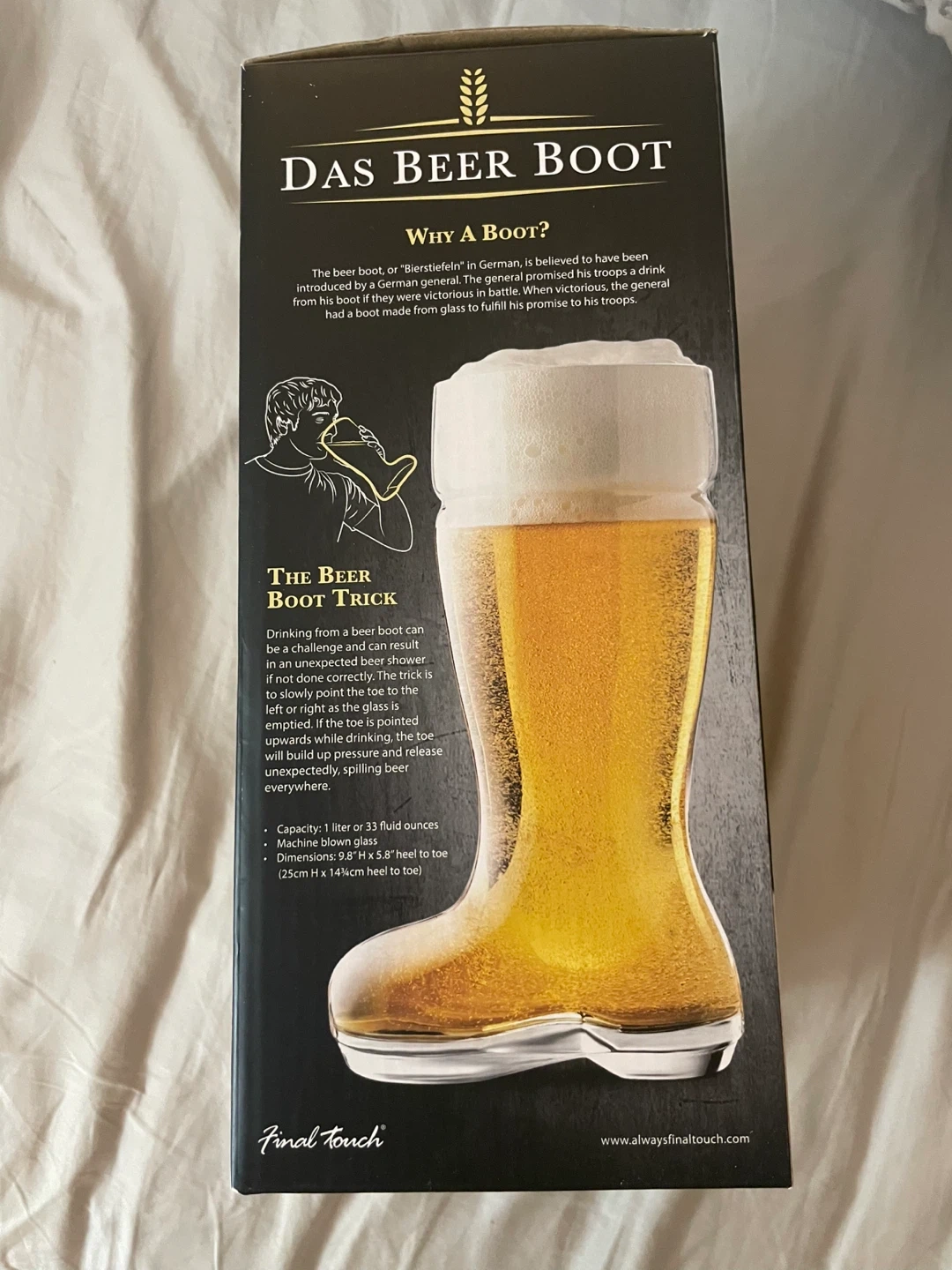 This is a 1-liter Das Beer Boot glass. It's made of glass and measures 9.8" H x 5.8" heel to toe. It's a fun novelty item for enjoying your favourite beverage!