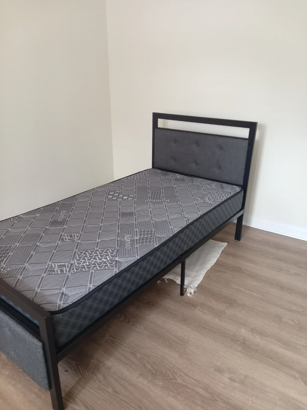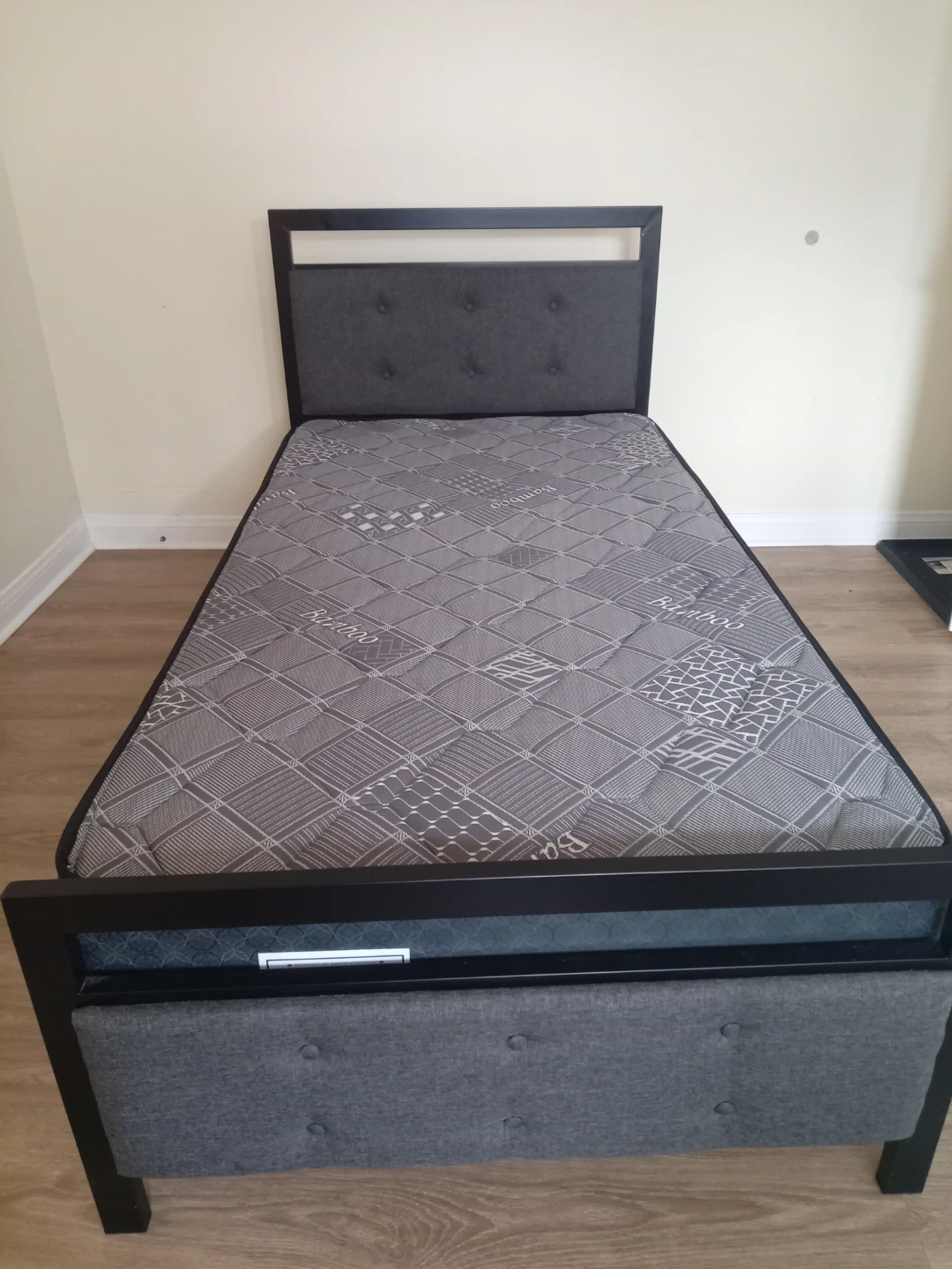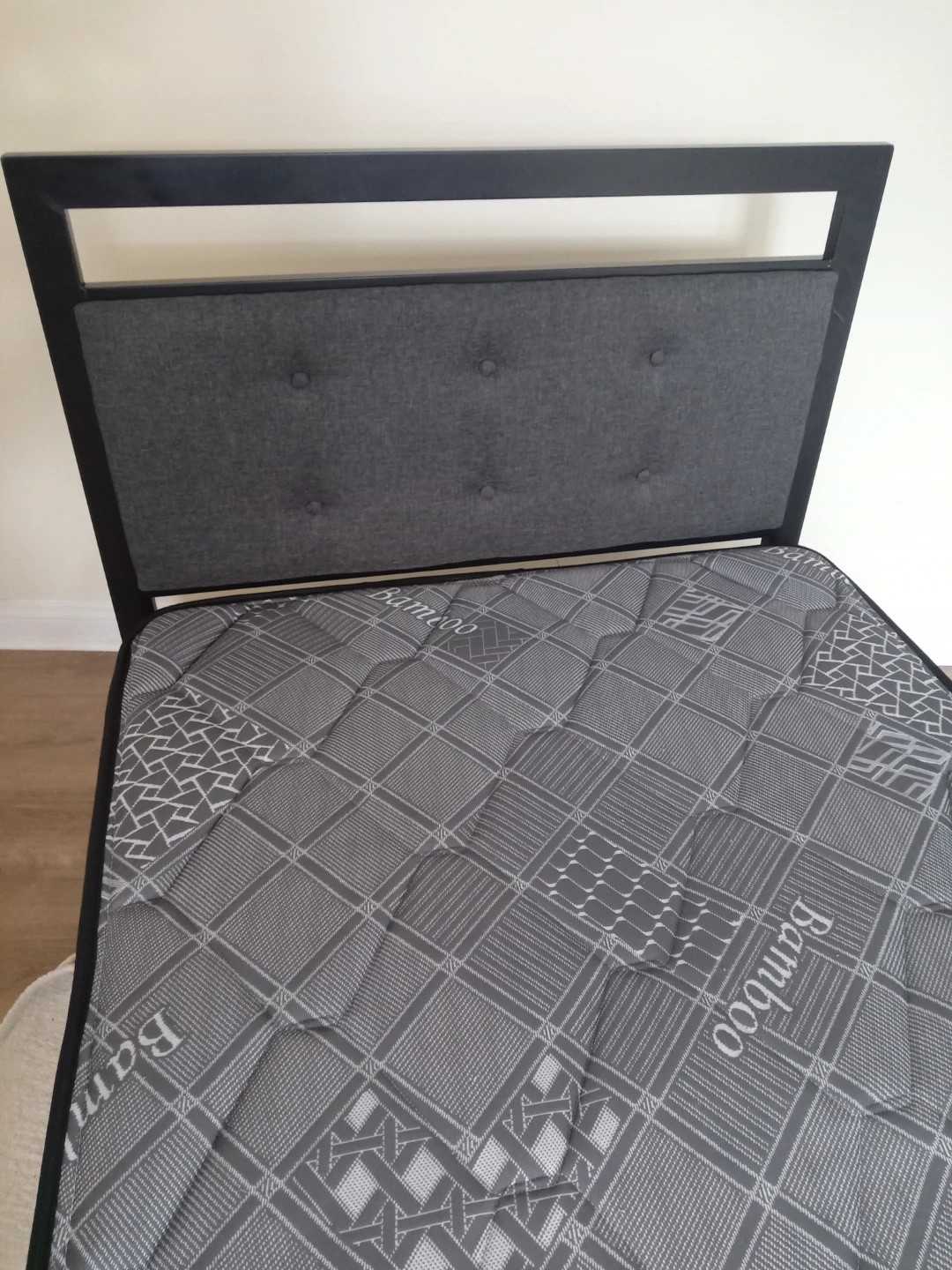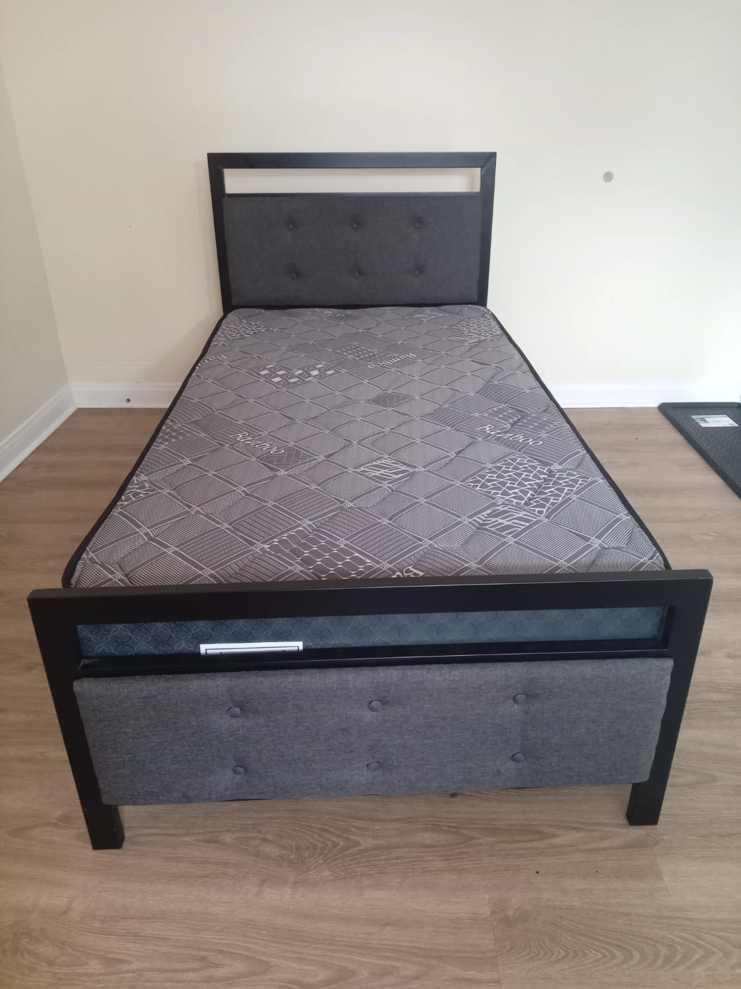 Twin size bed frame with a grey upholstered headboard and footboard. Includes a grey patterned mattress with "Bamboo" printed on it. Great for a smaller room or guest space! used on fo 4 months only