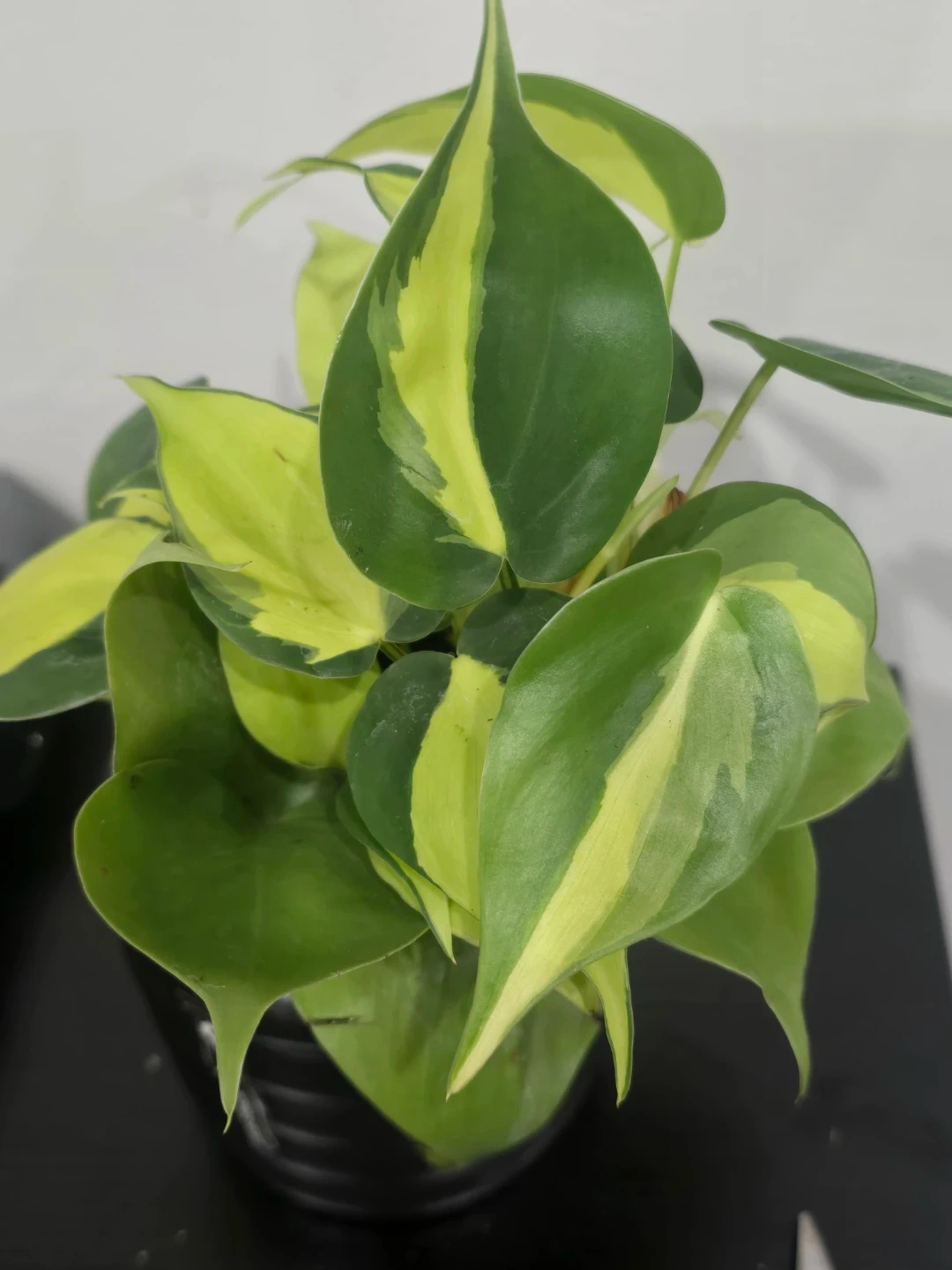 A lovely Philodendron Brasil plant with heart-shaped leaves featuring green and yellow variegation. It's in a black pot.
