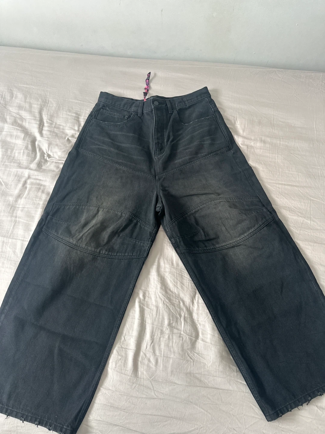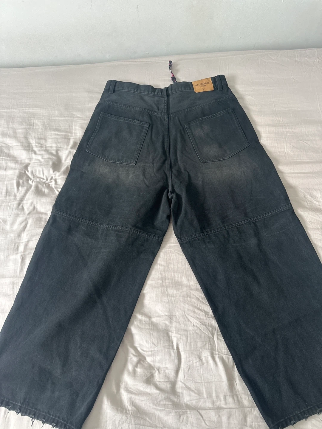 Balenciaga Unisex wide leg jeans in black denim. These pants feature a unique panel design and a distressed look. They're made from durable denim material.