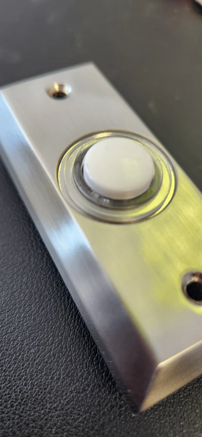Brushed metal doorbell button with a white push-button. Mounts easily with two screws. It has two connection terminals on the back.