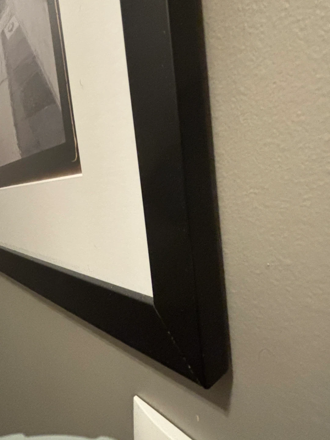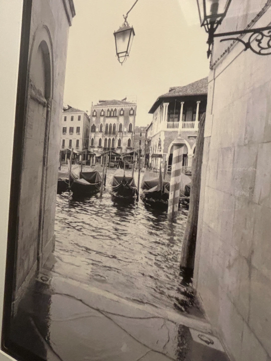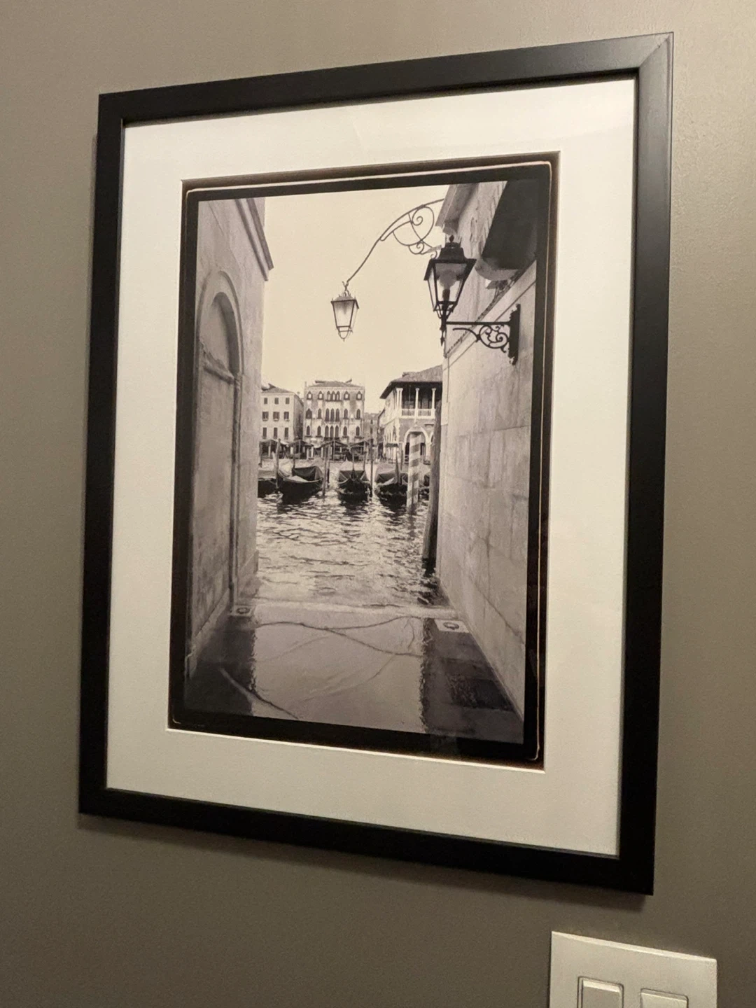Framed print of a classic Venice canal scene, featuring gondolas and historic architecture. Black frame with white matting. Ready to hang!