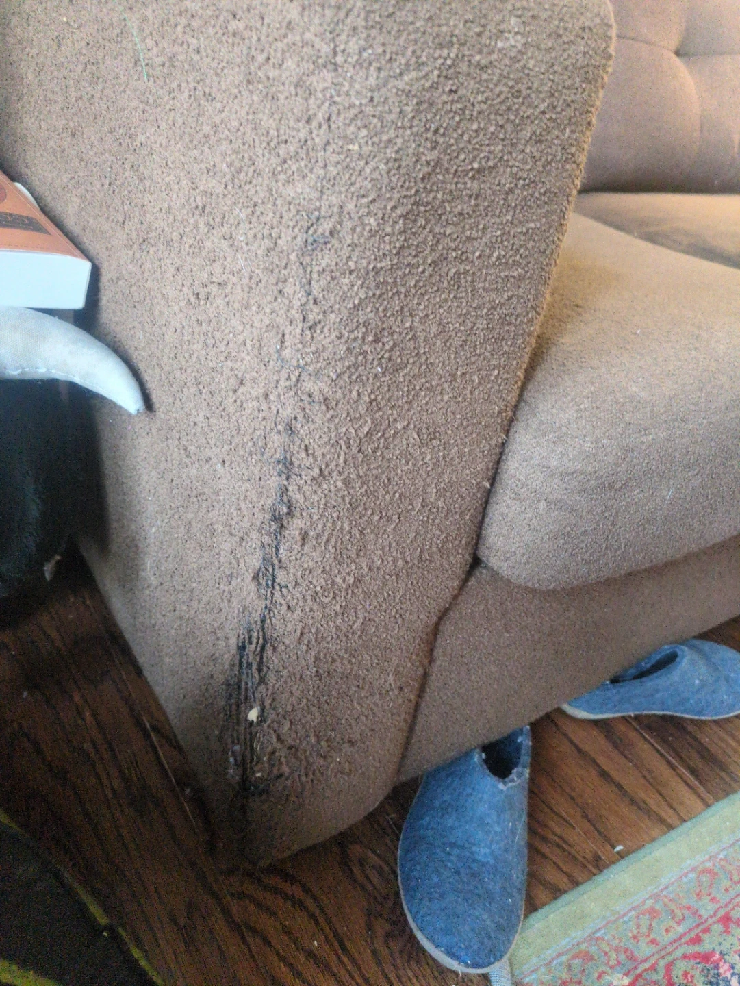 A comfortable brown fabric sectional sofa. It has tufted seat cushions and a textured upholstery. Some wear is visible on the corner seam. This Sofa-bed has a spring mounted hide-a-bed sized as a queen.