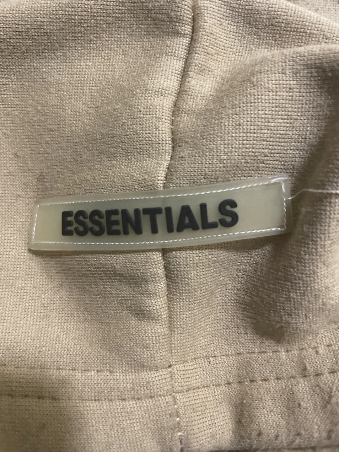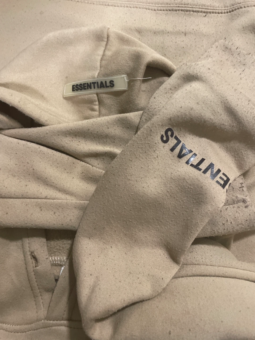 Selling a beige Essentials hoodie! It has the Essentials logo on the front and the sleeve. It's in good condition and ready for a new owner