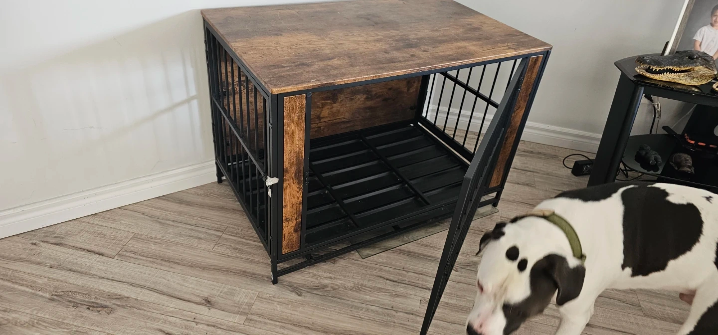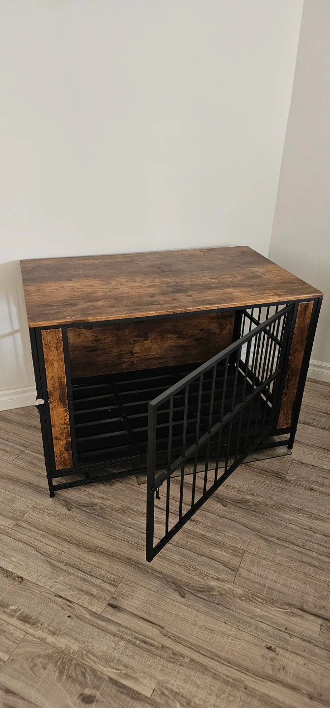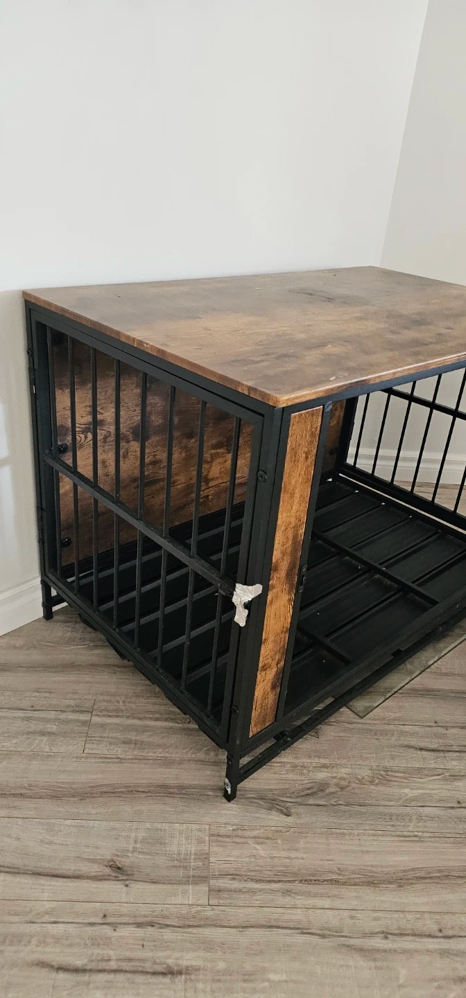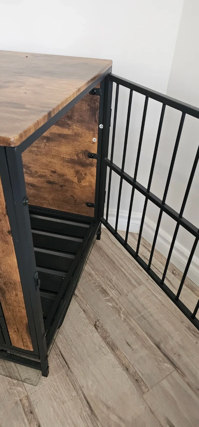Stylish dog crate designed to look like an end table. It's made with a wood-look top and black metal framing and bars. This crate features a front-opening door with a secure latch. It's a nice way to provide your dog with a cozy den while complementing your home decor.