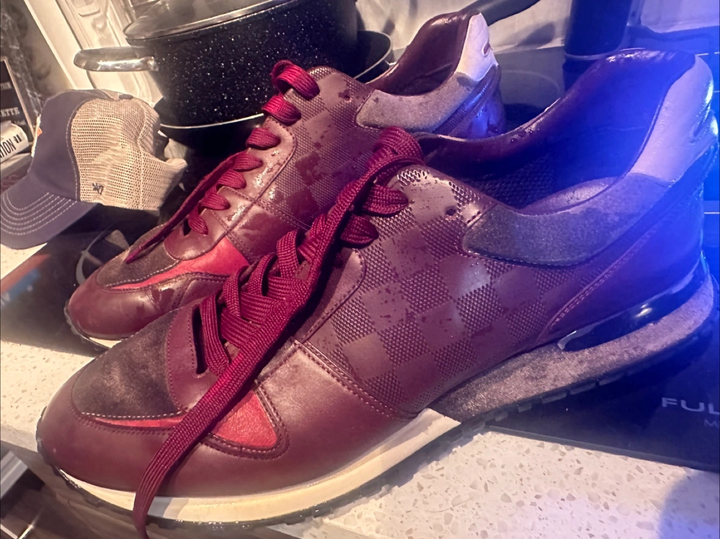 Pair of burgundy leather running shoes. Features a checkered pattern. Great condition paid 2500