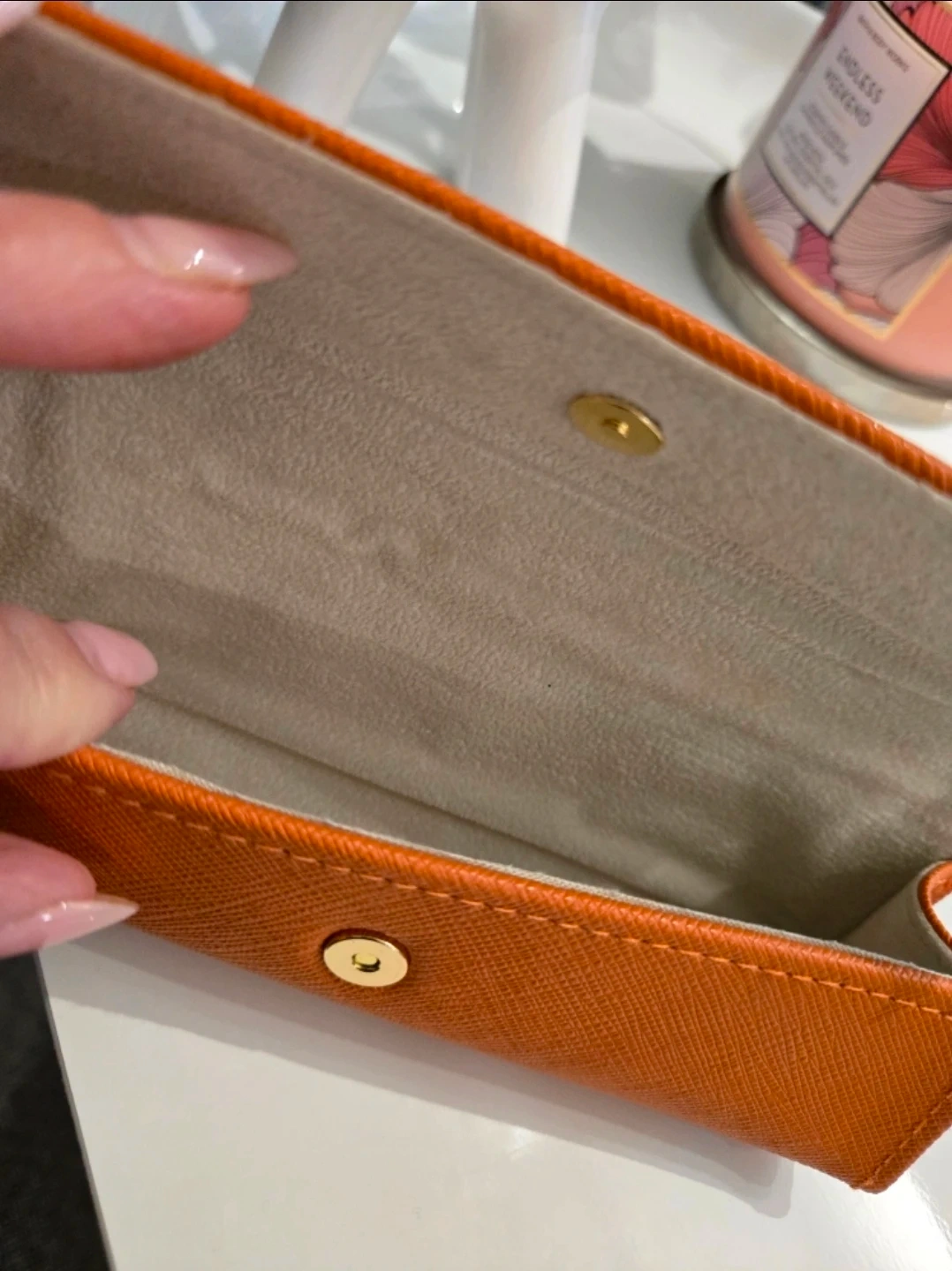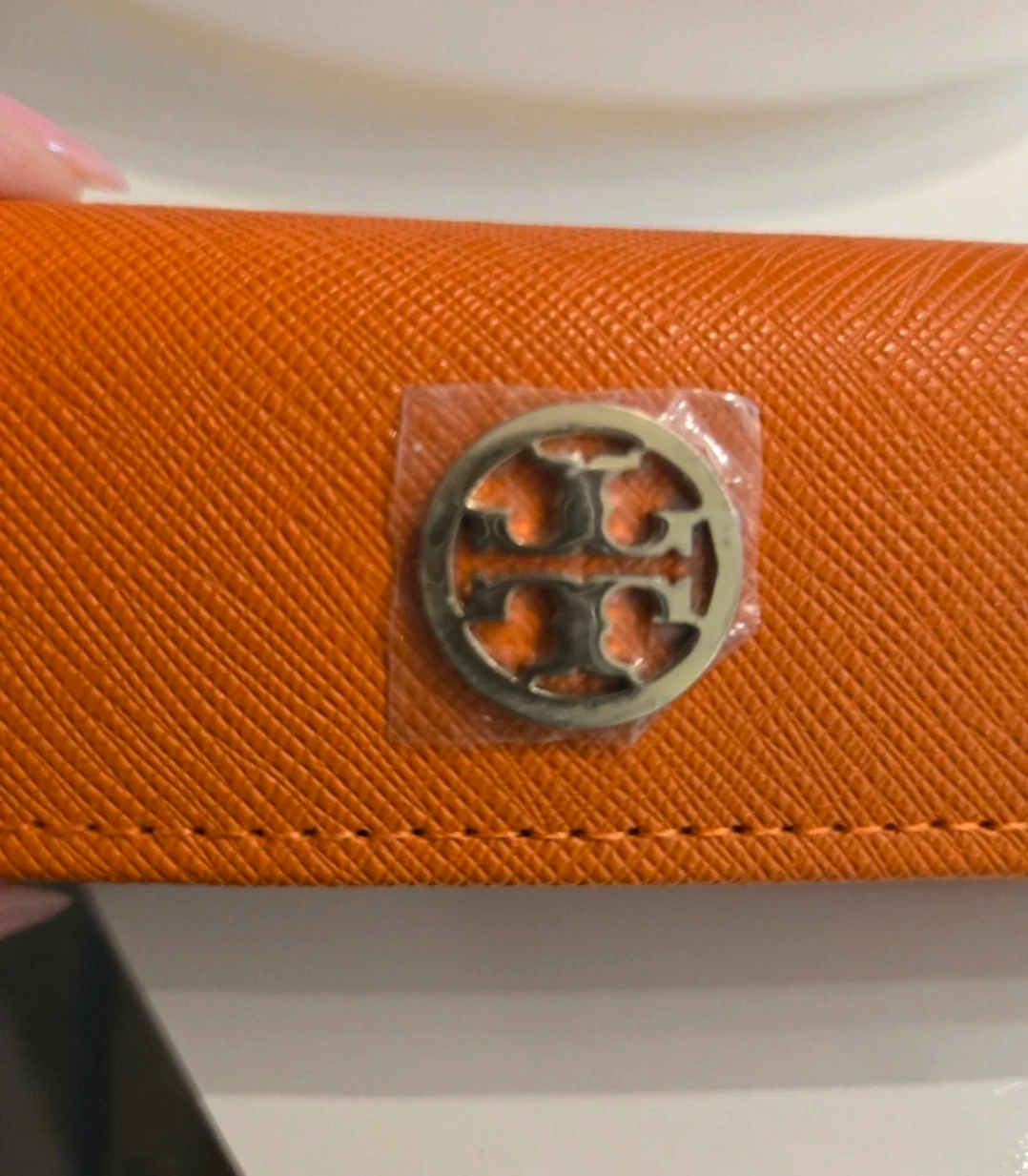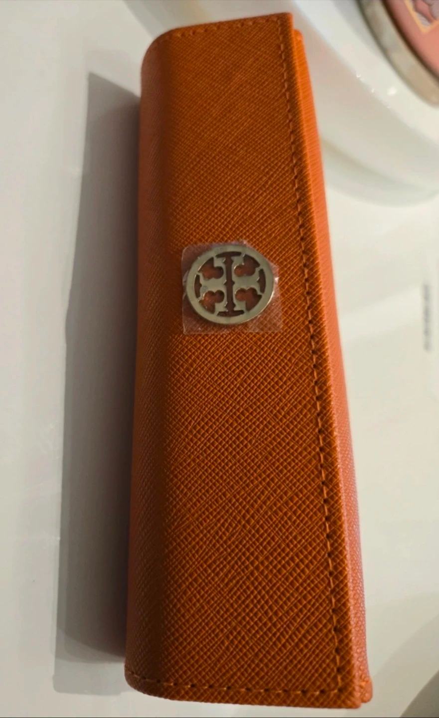 NEW! Tory Burch eyeglass case in a vibrant orange colour. It's made from saffiano leather with a soft interior lining. Magnetic snap closure keeps your glasses secure!