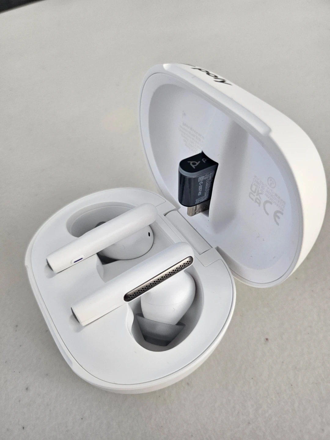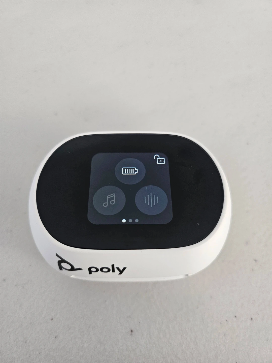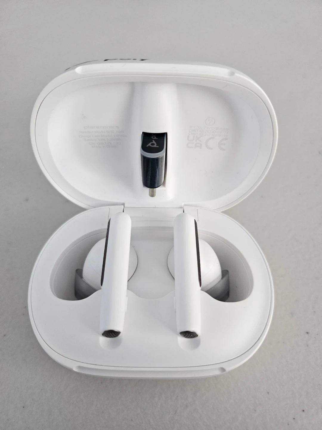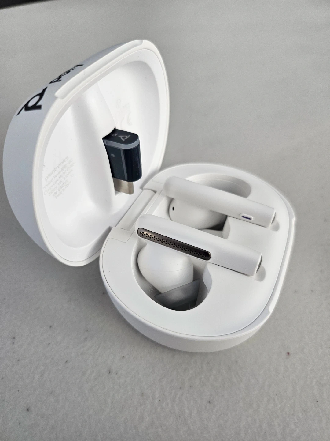 Poly Voyager Free 60+ earbuds in white. Includes the touchscreen charging case. These wireless earbuds offer clear audio for calls and music. Case has a USB-C charging port.