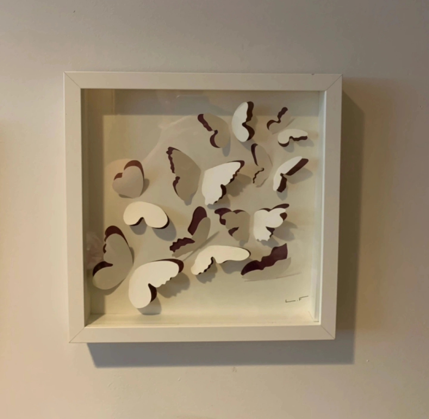 White framed /shadow box-artwork. Features multiple white paper butterfly cutouts
