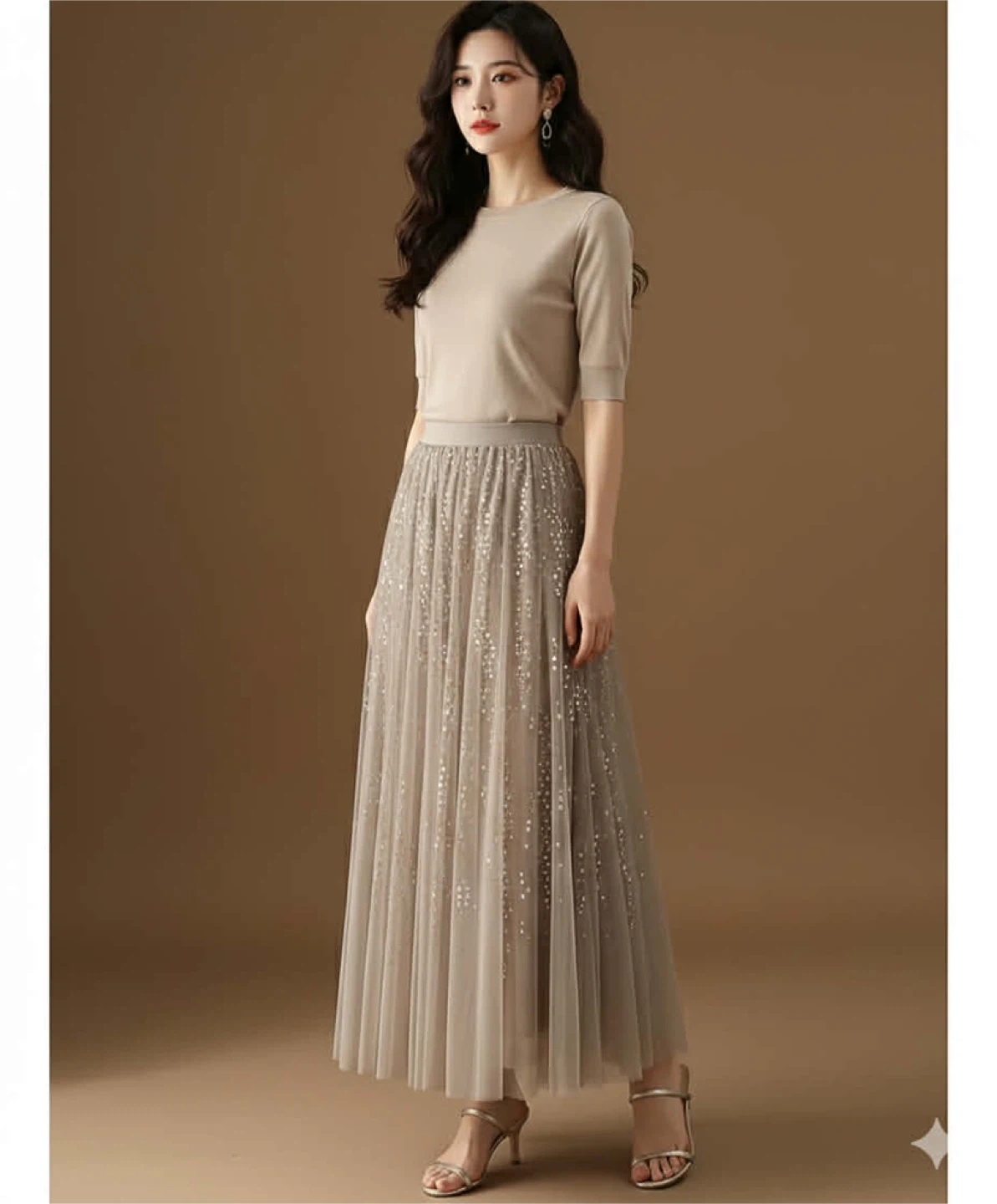 This elegant maxi skirt features a delicate tulle overlay with scattered sequins. It has an elastic waistband for a comfortable fit. The material is lightweight and flowing, perfect for special occasions. Measures approximately 38 inches long.