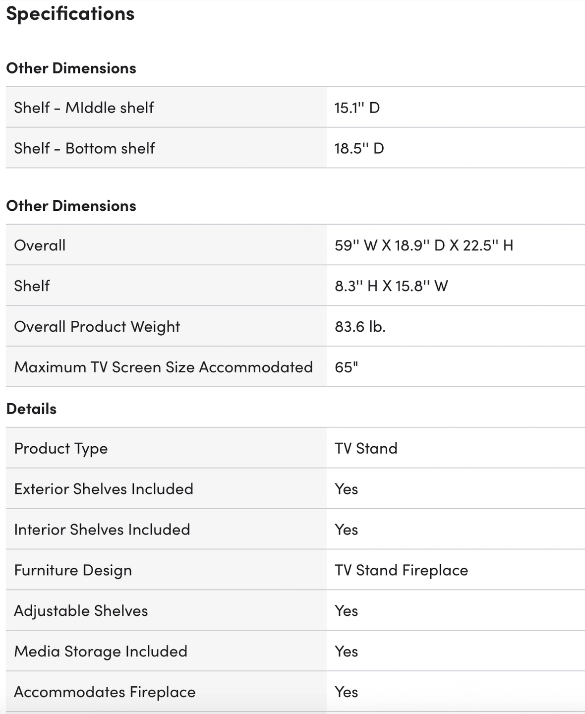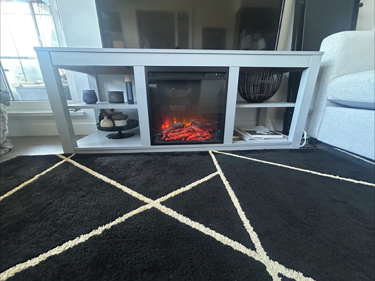 Current Retail: $622 CAD Features flickering faux flame fireplace cabinet, this TV stand doubles as a heating unit. Whether catching the evening news before getting ready to hit the hay or cheering on your favourite team during the big game, your entertainment area plays an important role in your abode. It’s made from manufactured wood awash in a solid neutral colour, and includes four open compartments for keeping your cable box, movie collection, media player, and more. Dimensions: 59'' W X 18.9'' D X 22.5'' H https://www.wayfair.ca/furniture/pdp/red-barrel-studio-azelio-tv-stand-for-tvs-up-to-65-with-electric-and-fireplace-included-c000580122.html?piid=1061060480