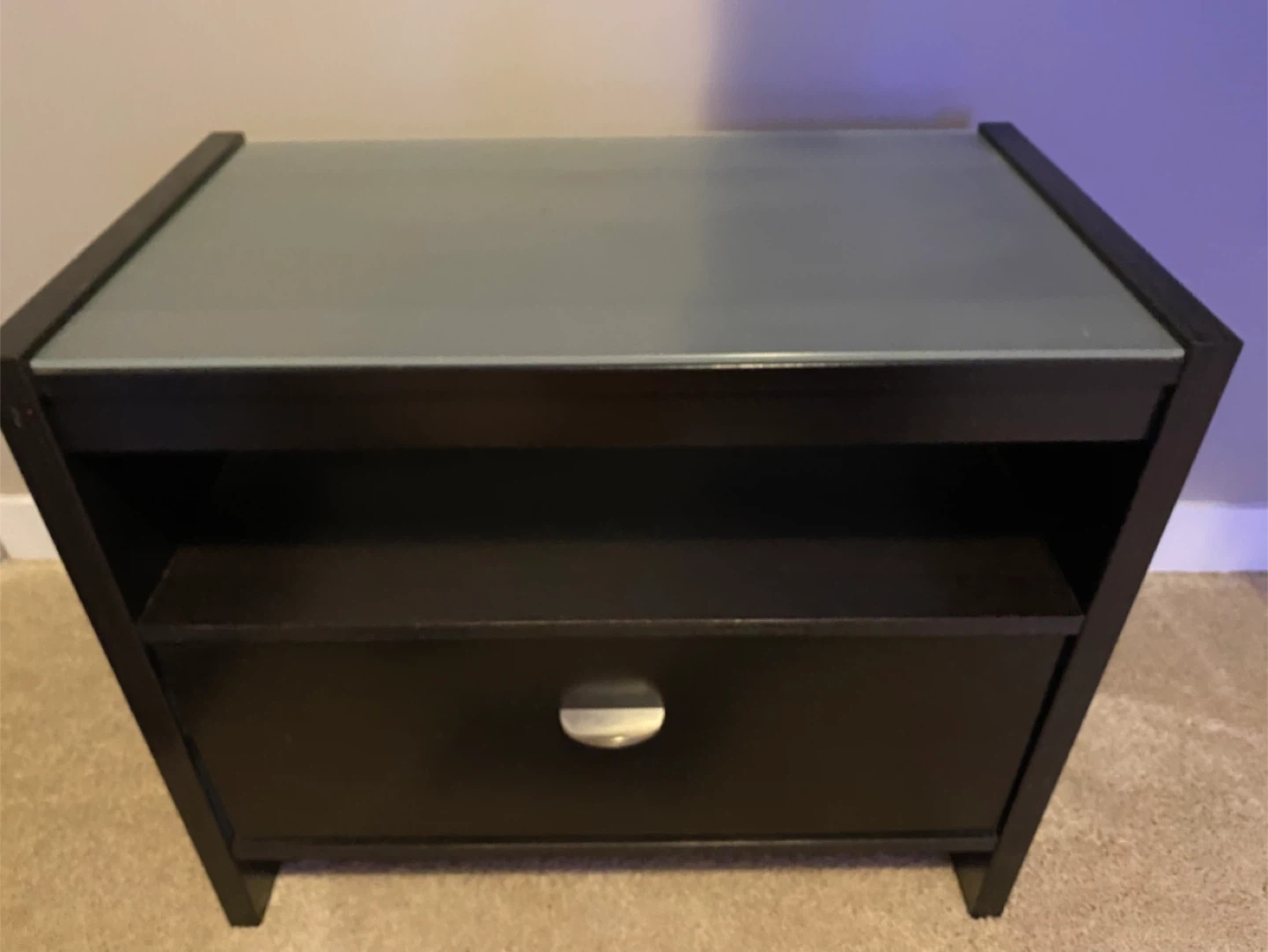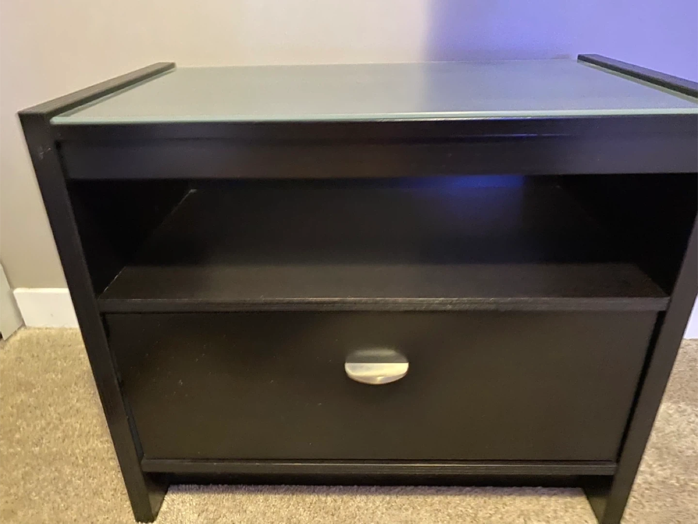 Here's a stylish black nightstand that would look great in any bedroom! It features a sleek glass top and a convenient drawer for storage. The nightstand is in good condition and ready to use. It also has an open shelf for extra storage or display