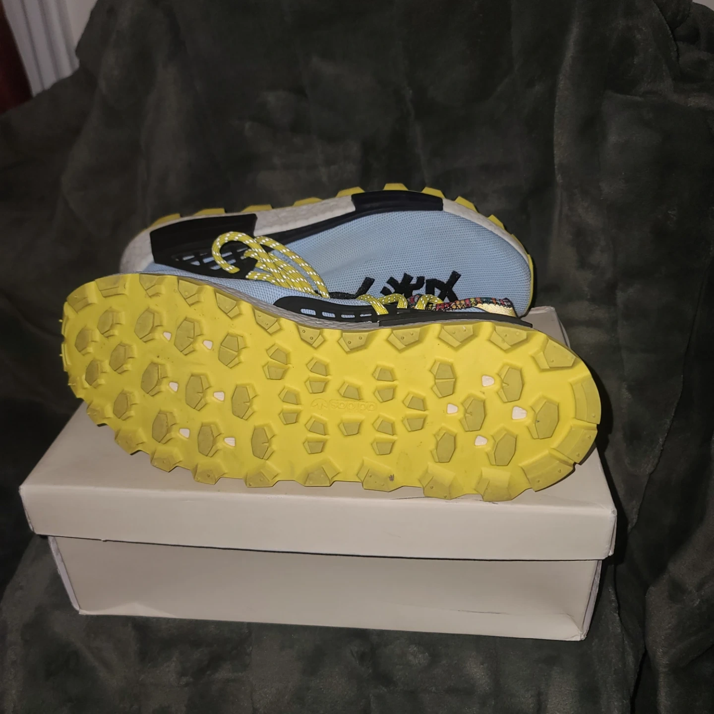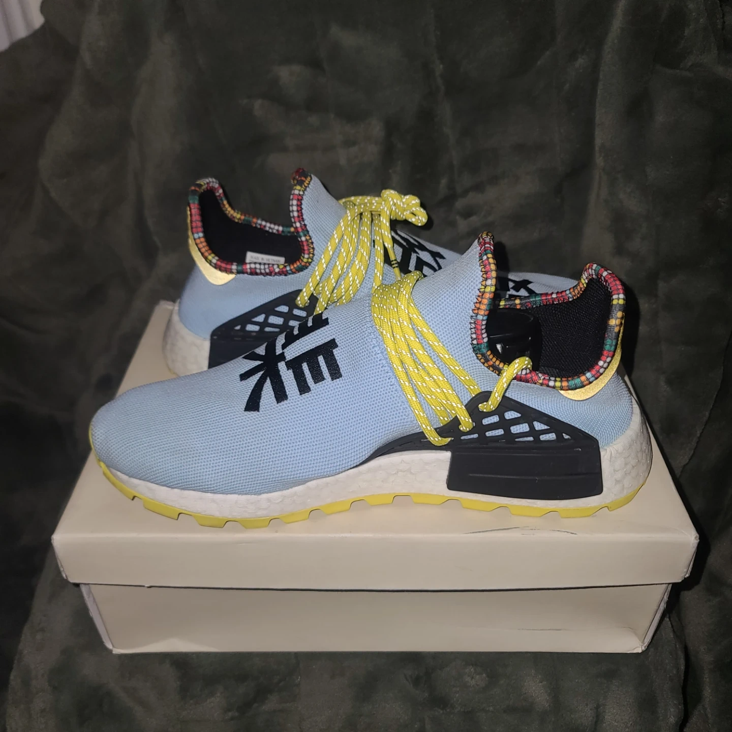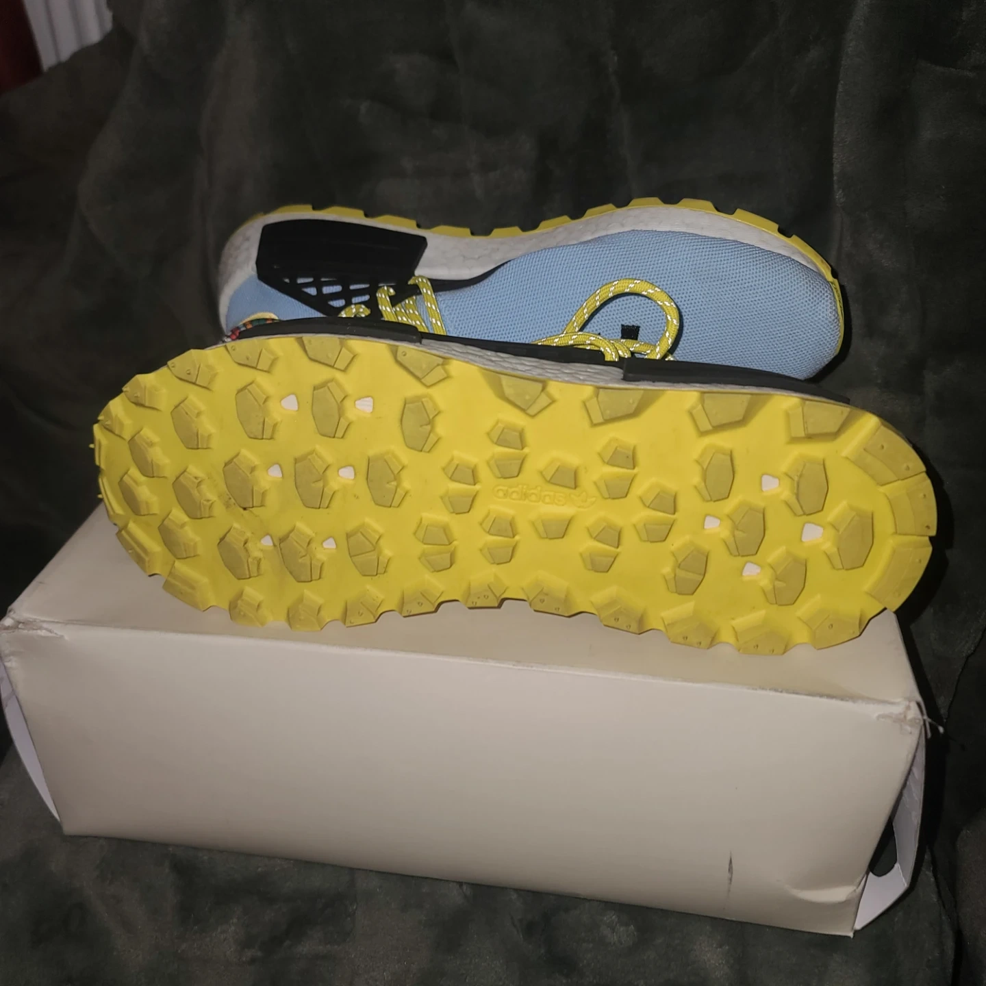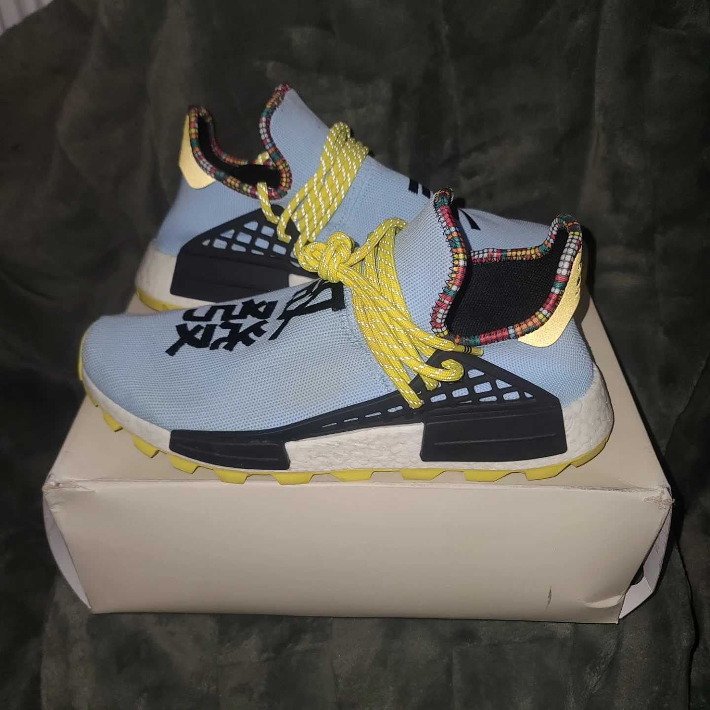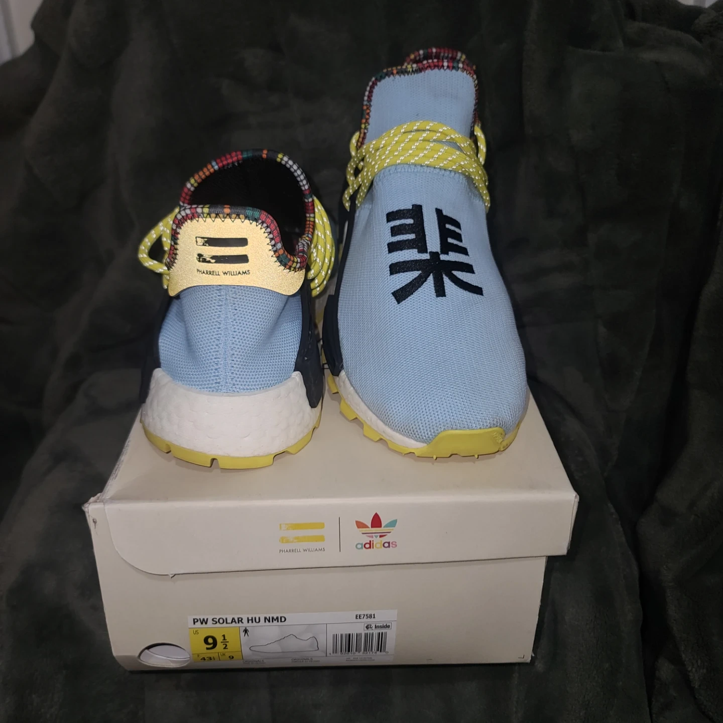 These are Adidas Pharrell Williams Solar Hu NMD shoes. They're a size 9.5 and come in light blue with yellow laces. Includes original box!
