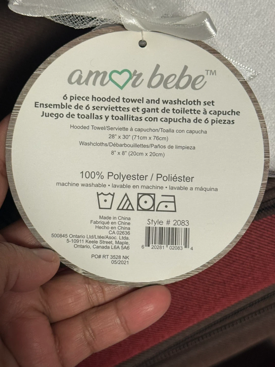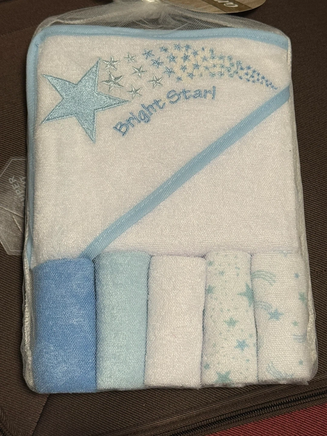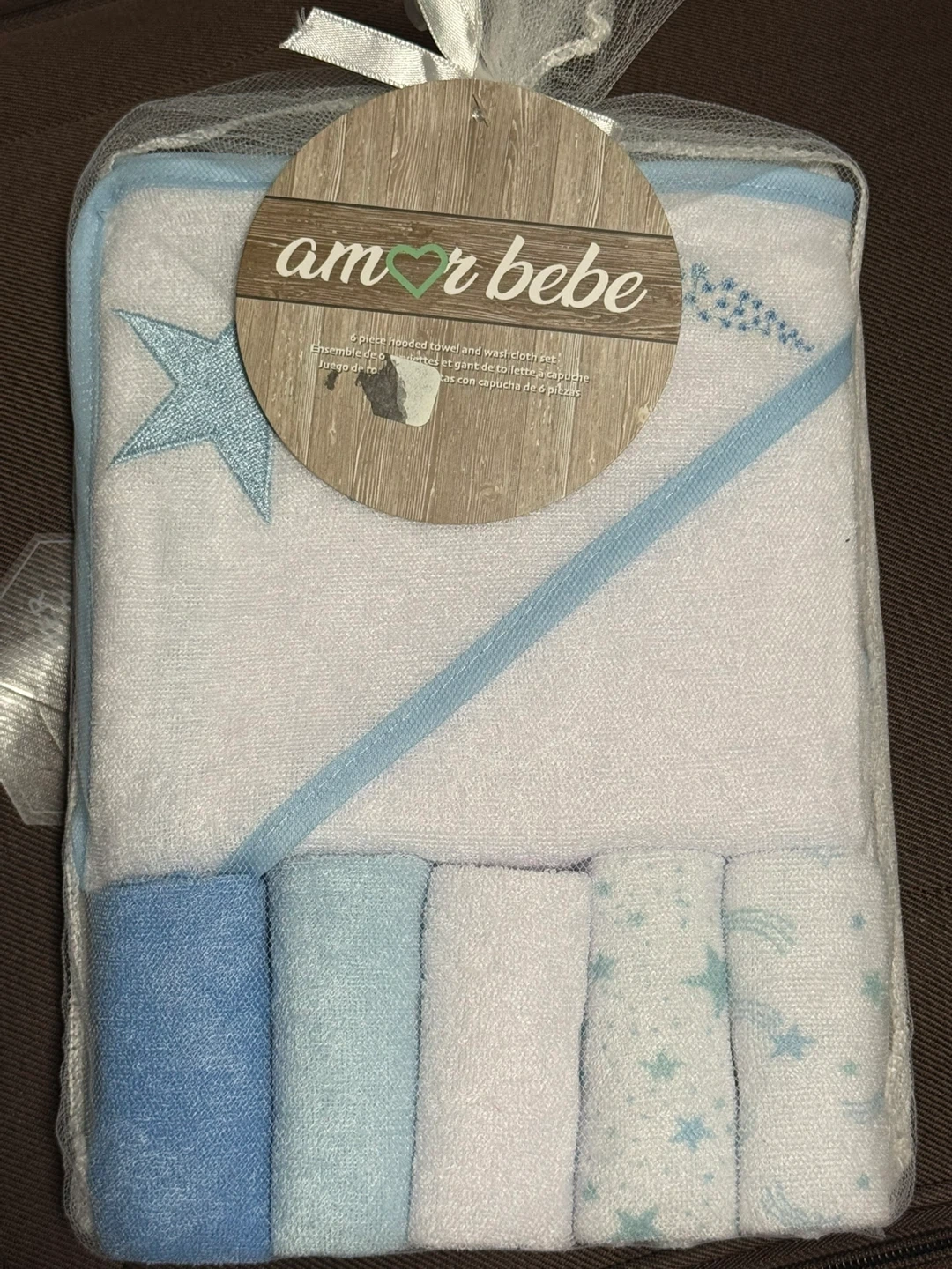 This Amor Bebe set includes one 28" x 30" hooded towel and five 8" x 8" washcloths. The set features a "Bright Star" design with blue accents. It's made of 100% polyester and is machine washable. This set is perfect for babies and toddlers after bath time!
