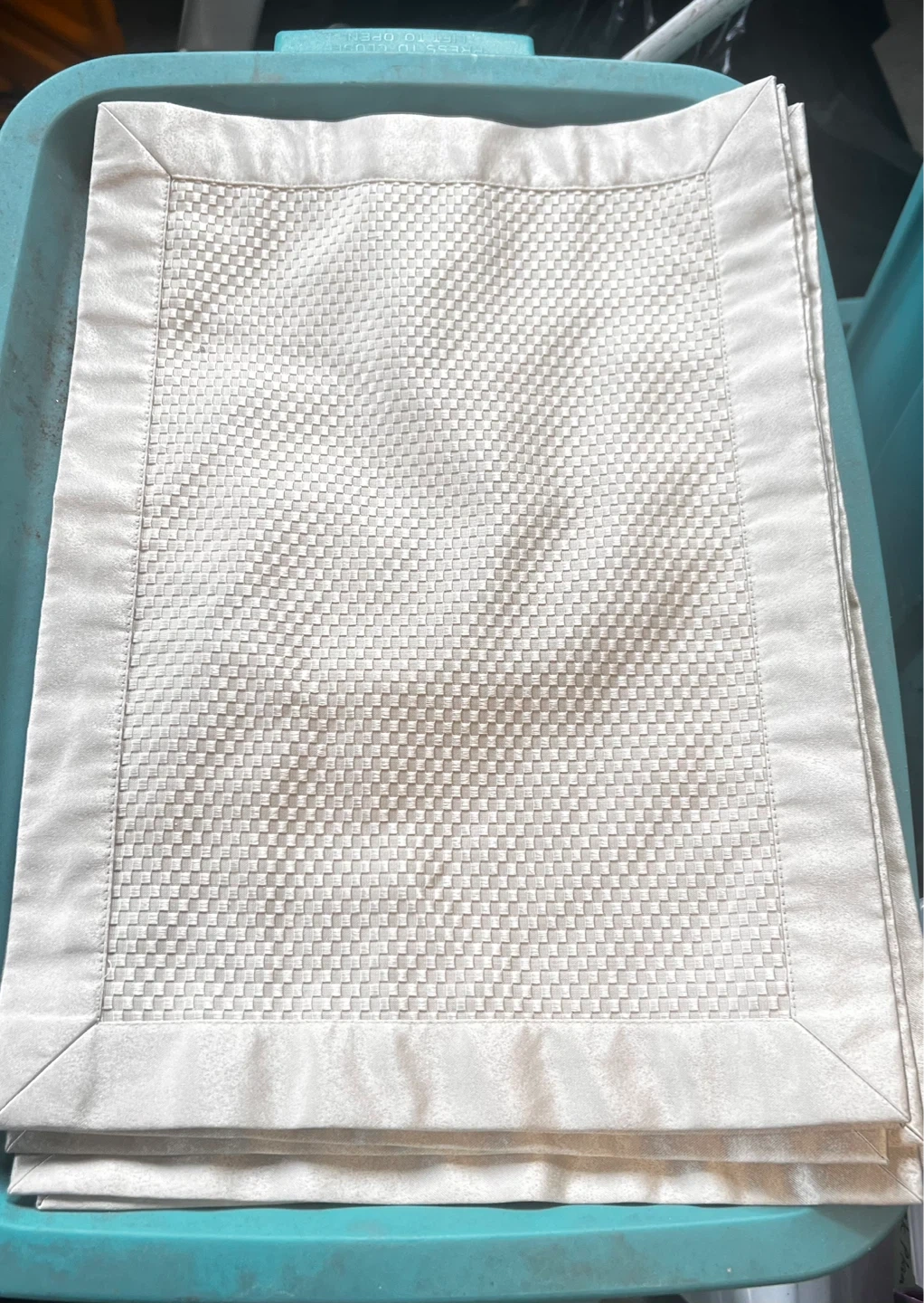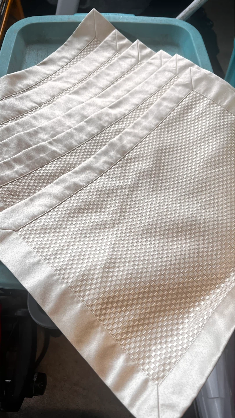 This is a set of six beige placemats. They're made with a textured woven centre and satin-like border. These would be great for everyday use or special occasions!