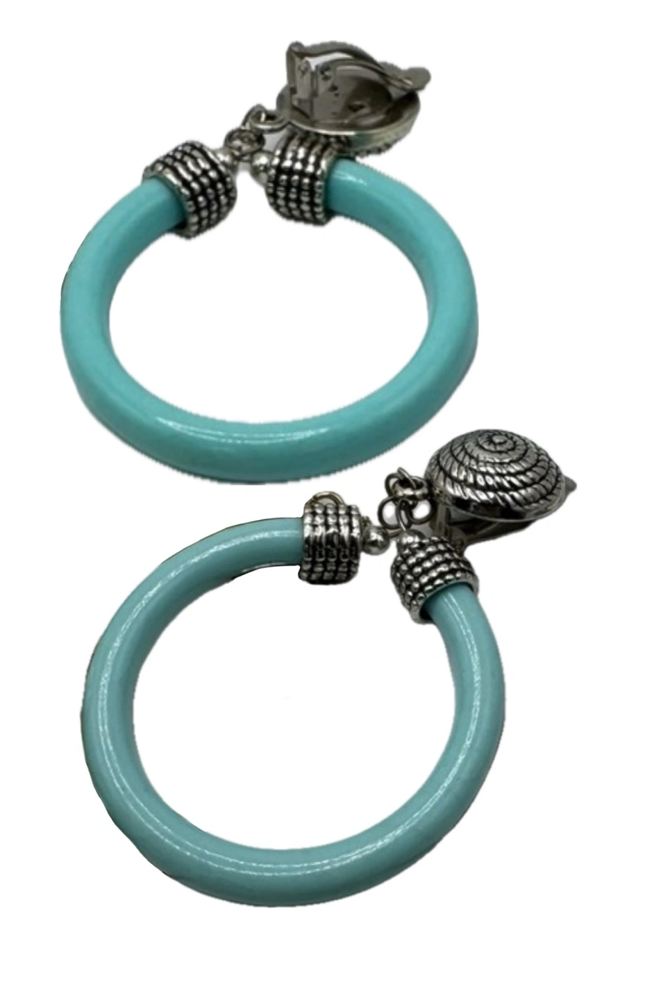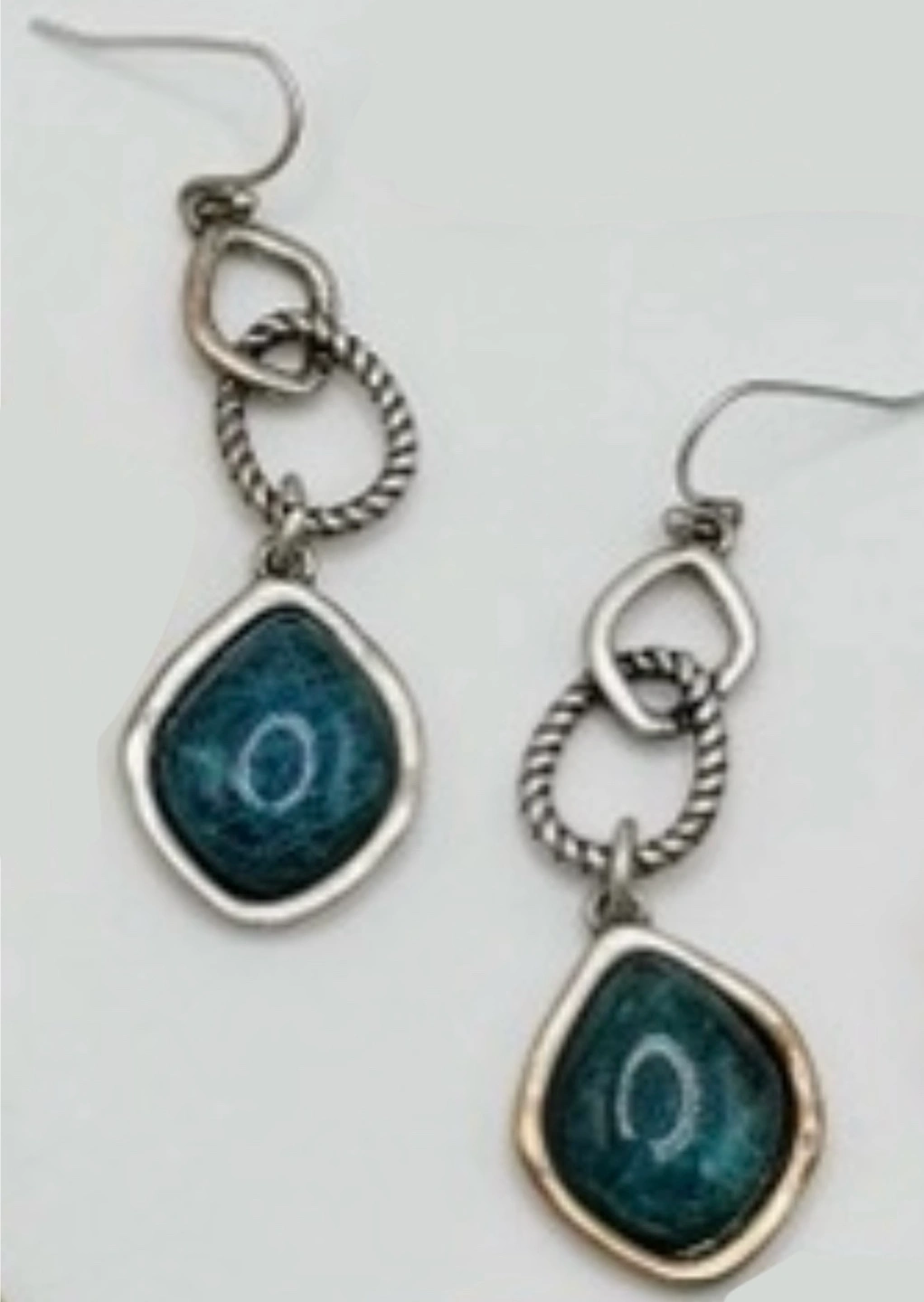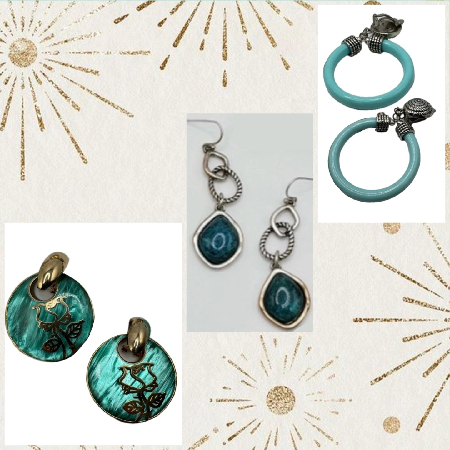 Three pairs of earrings. One pair light teal clip-on hoops with silver accents. Another pair features dark teal circular designs with gold-tone accents. The third pair are silver tone dangle earrings with dark teal stones.