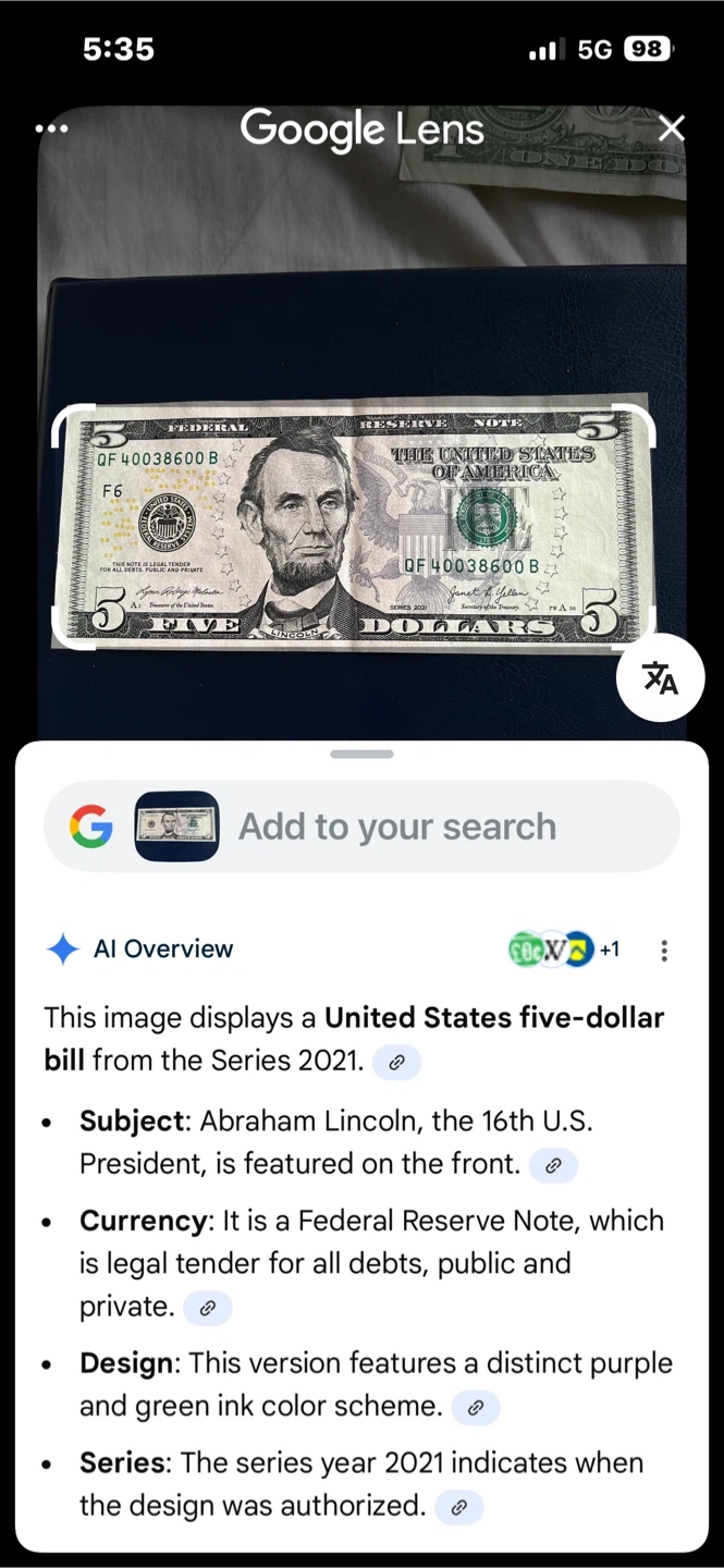 This is a U.S. Federal Reserve Note for five dollars, featuring Abraham Lincoln on the front. It's from the Series 2021 with a distinct purple and green ink colour scheme. The reverse shows the Lincoln Memorial.
