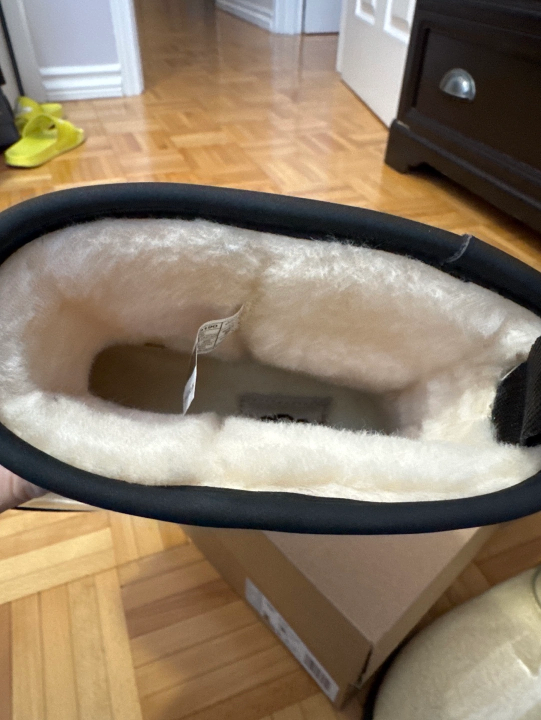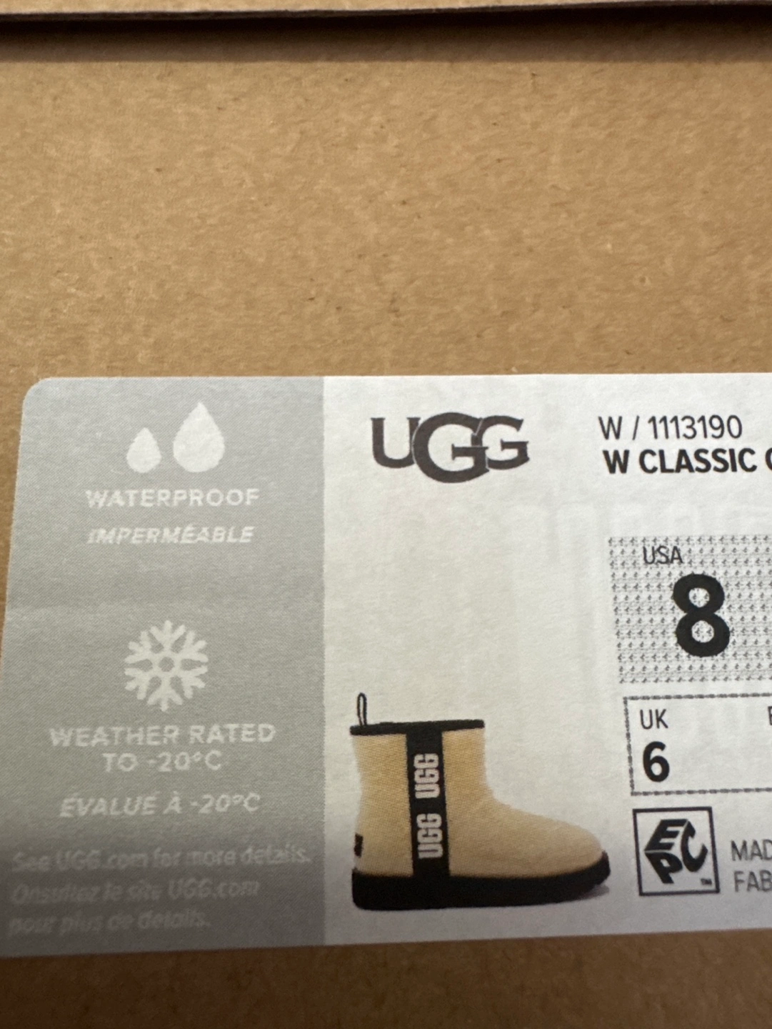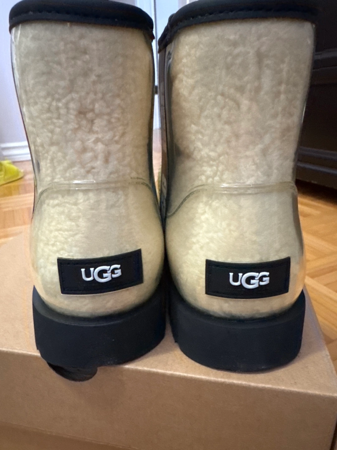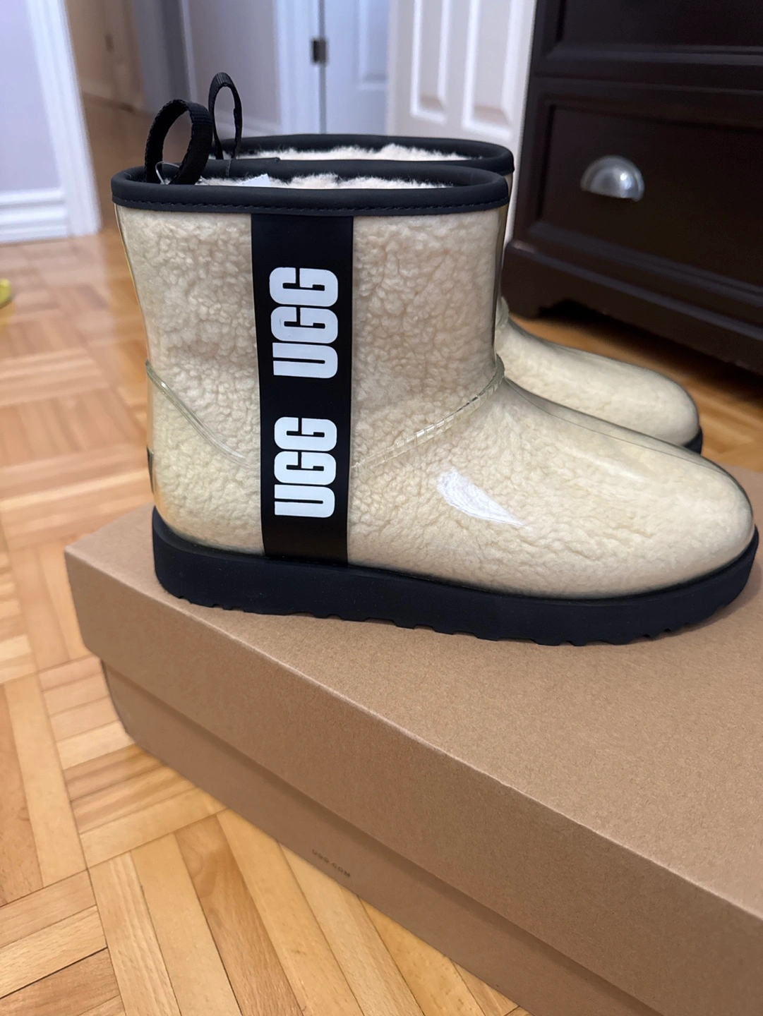 Waterproof women's UGG boots. Size 8. Clear upper with cream shearling interior. Black outsole. Brand new in box.