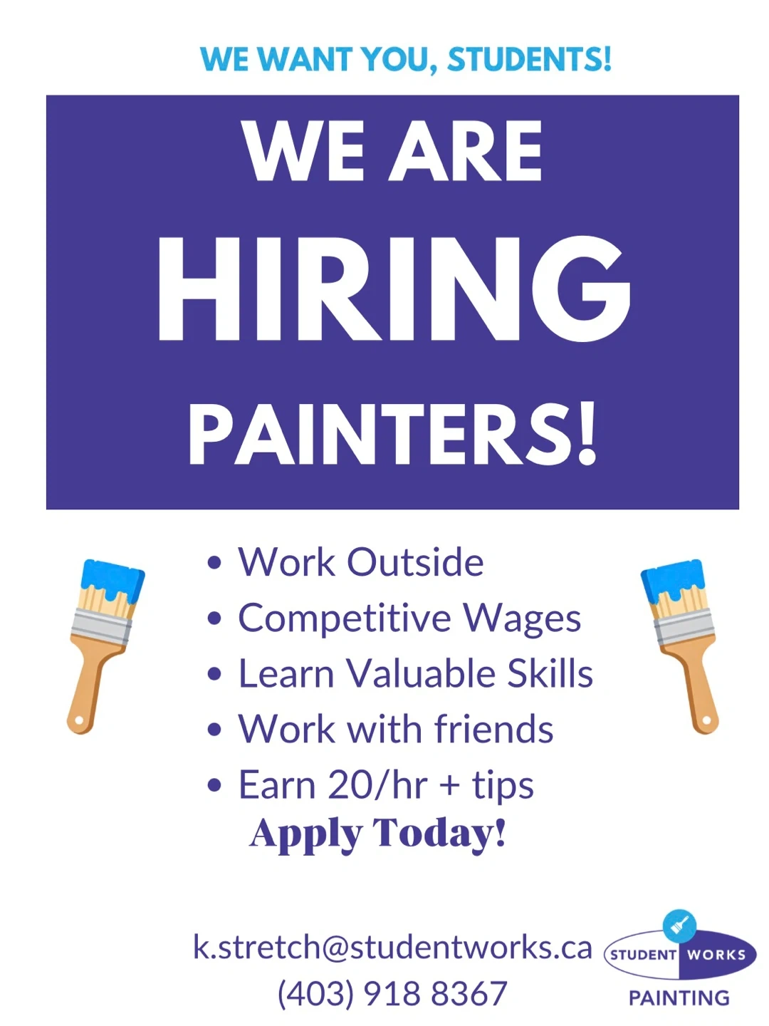 We're hiring painters! Earn $20/hr (starting wage) plus tips. Work outside and learn valuable skills. Apply today!