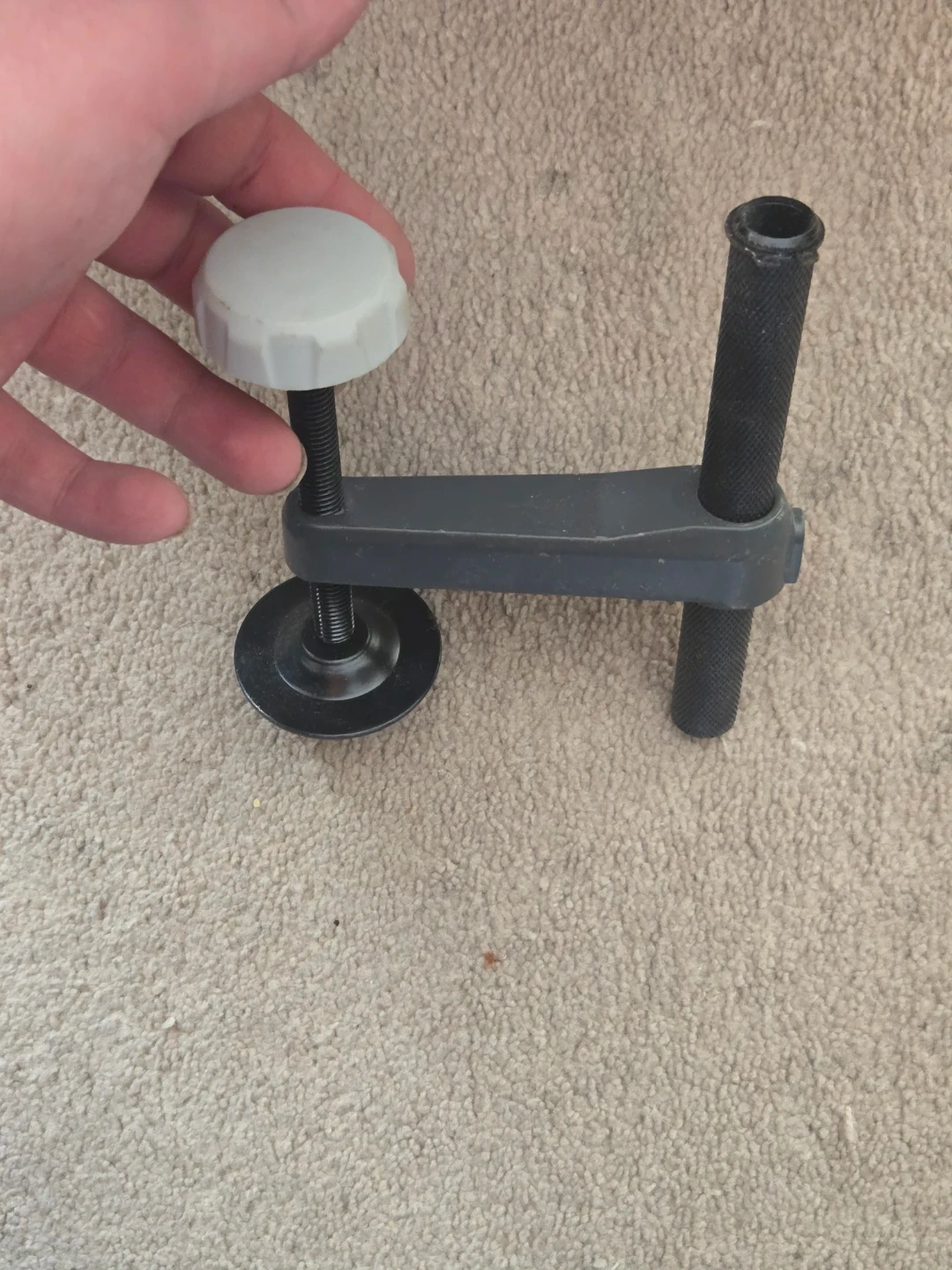 ryobi Miter saw adjustable clamp with two knobs. It's made of grey and black plastic and metal. The clamp has a threaded rod and a rotating base for tightening. It also features a textured handle for grip.