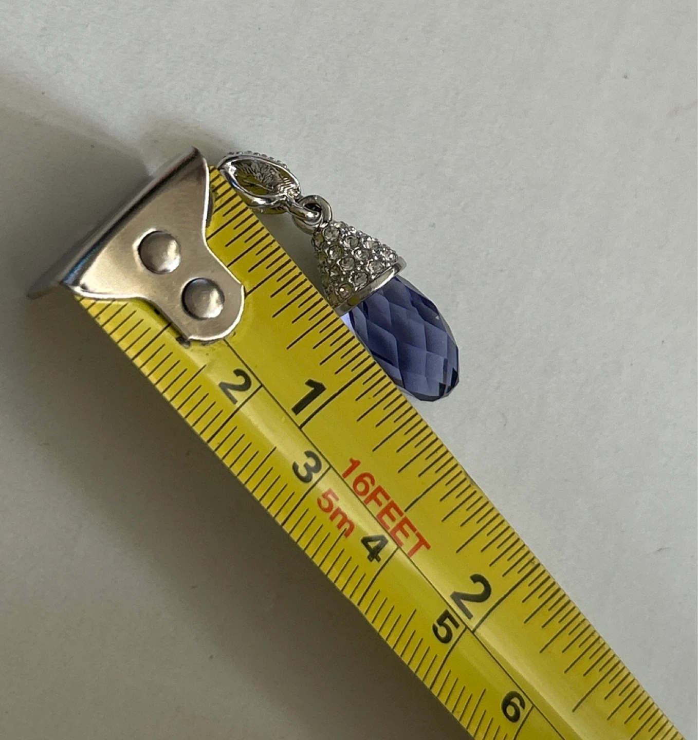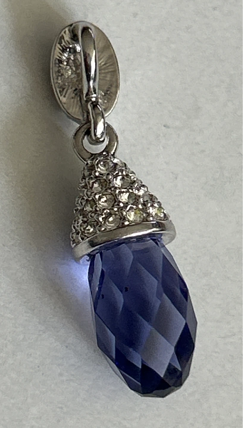 Silver-toned pendant featuring a faceted blue/purple gemstone and a cone-shaped bail encrusted with small rhinestones. It's a nice accent piece!