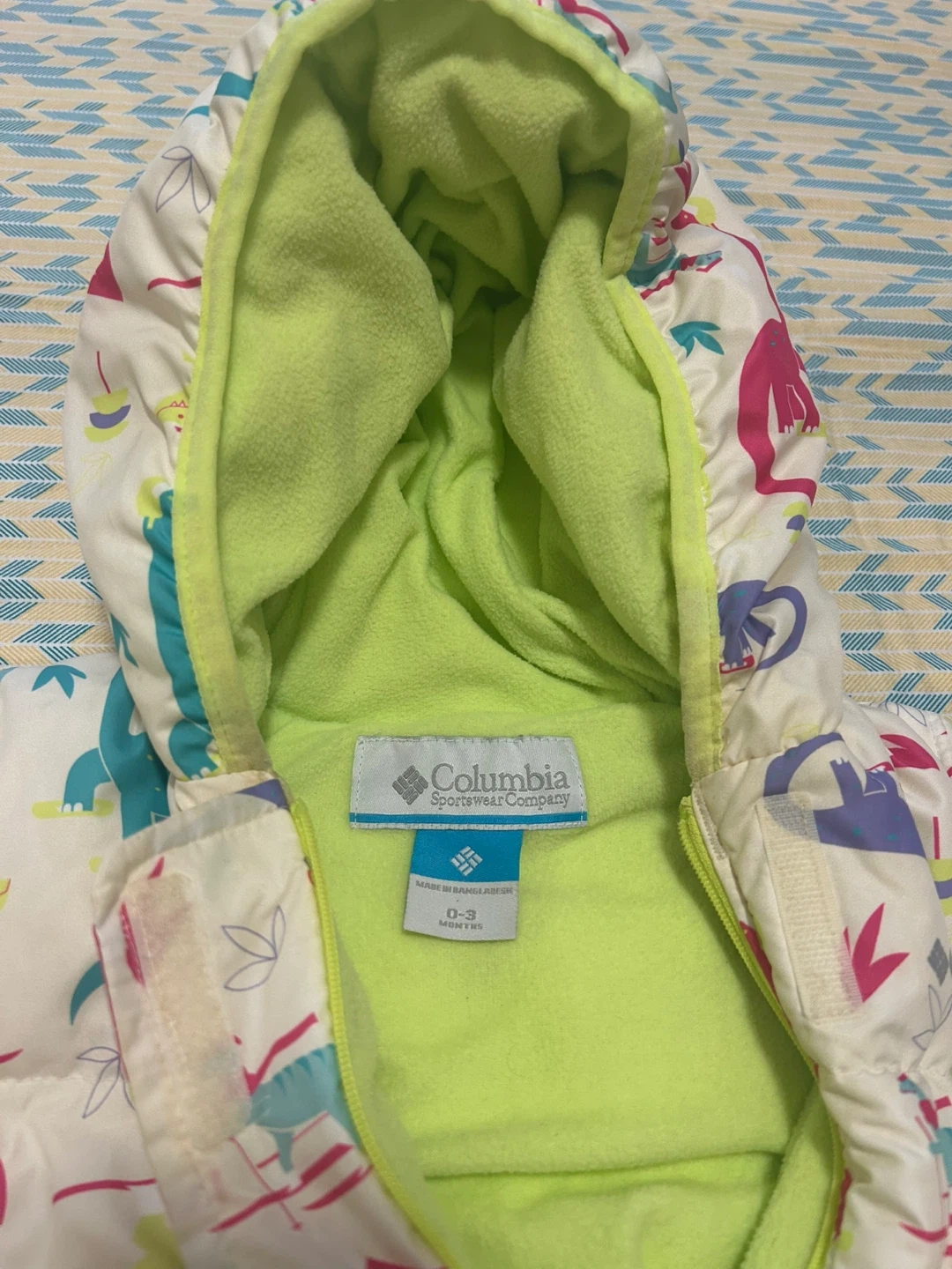 Keep your little one cozy with this adorable Columbia snowsuit! It features a fun dinosaur print and a soft, warm lining. Perfect for babies aged 0-3 months