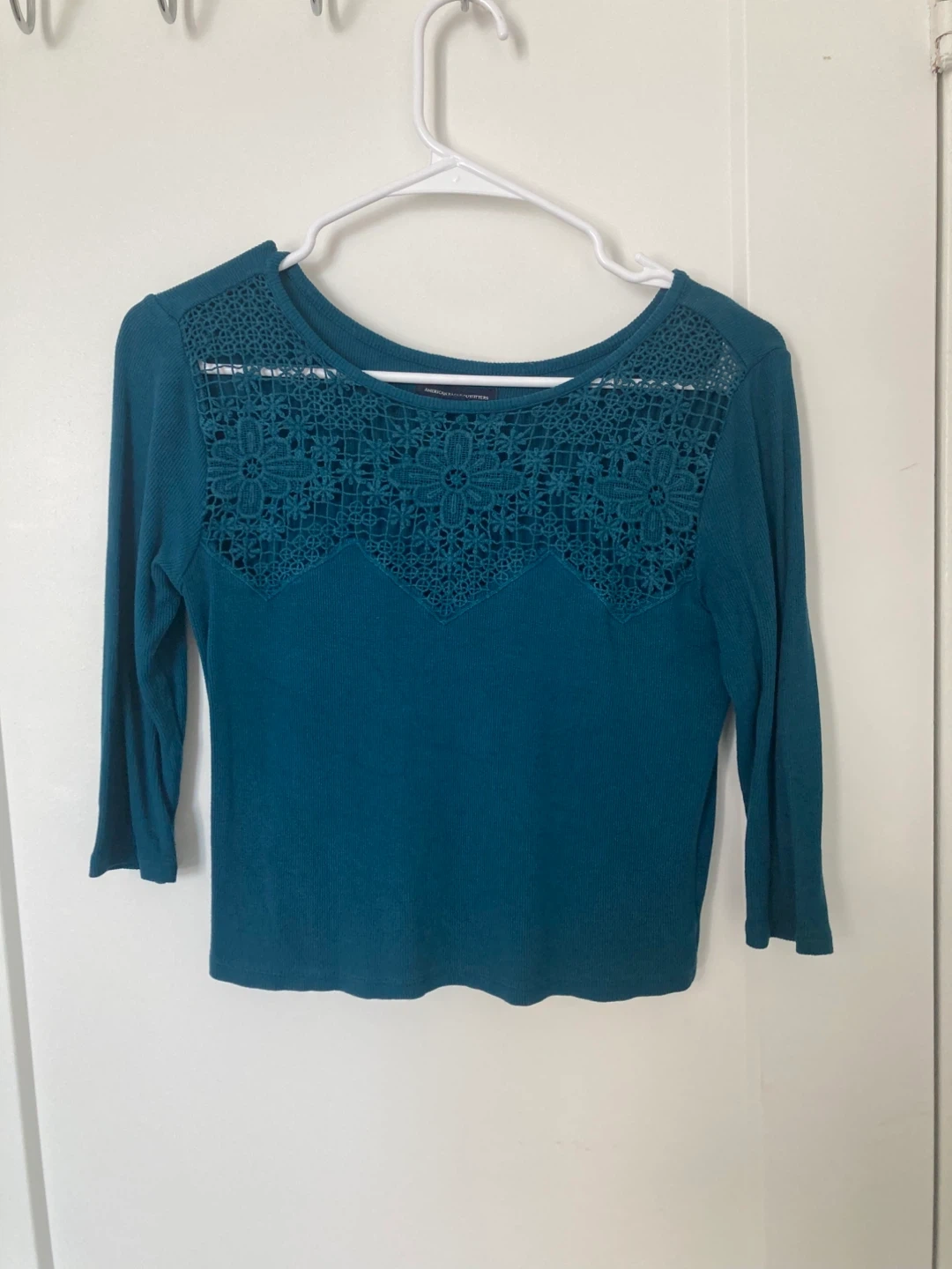 This is a teal-coloured top from American Eagle. It features a lovely crochet design on the upper chest area and has 3/4 sleeves. It's in great condition and ready for a new home!