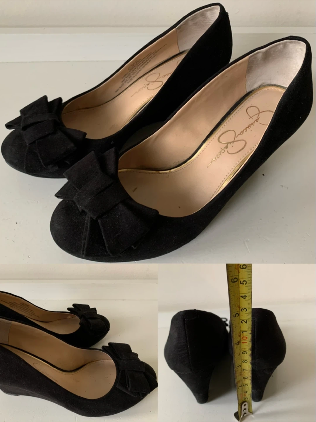 Selling a pair of Jessica Simpson black suede heels in size 5.5. They feature a cute bow detail and a comfortable wedge heel. Perfect for dressing up or causal with a pair of jeans!