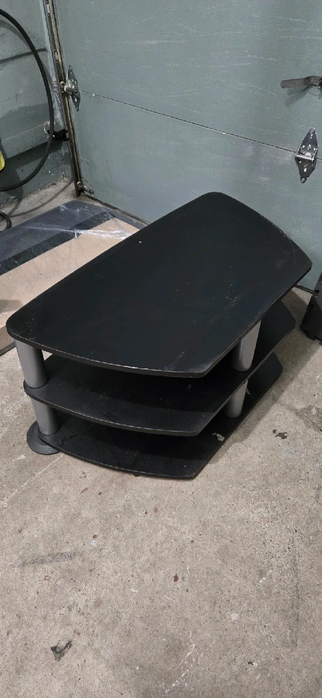 Selling a black TV stand with three shelves. It's perfect for organizing your media devices and accessories. It has some signs of use, but it's still in good condition and ready for a new home