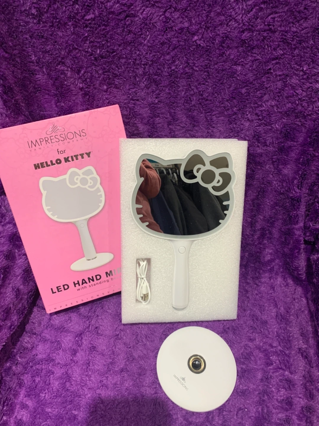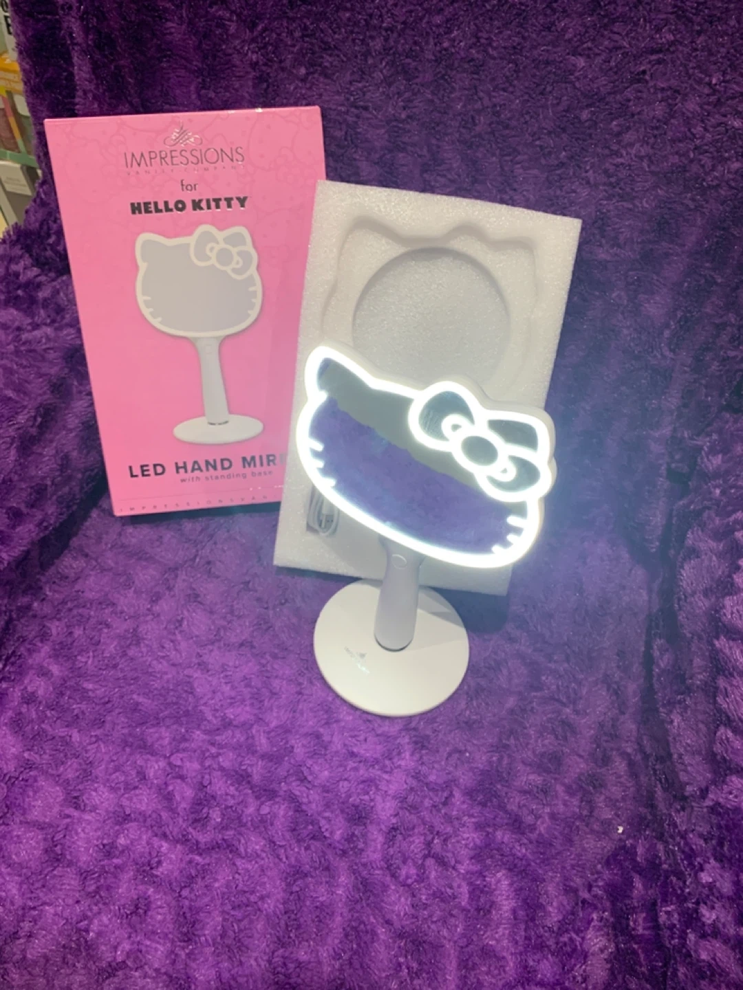 This Impressions for Hello Kitty LED hand mirror comes with a standing base and charging cable. It's perfect for touch-ups and makeup application anywhere. The mirror lights up for better visibility.