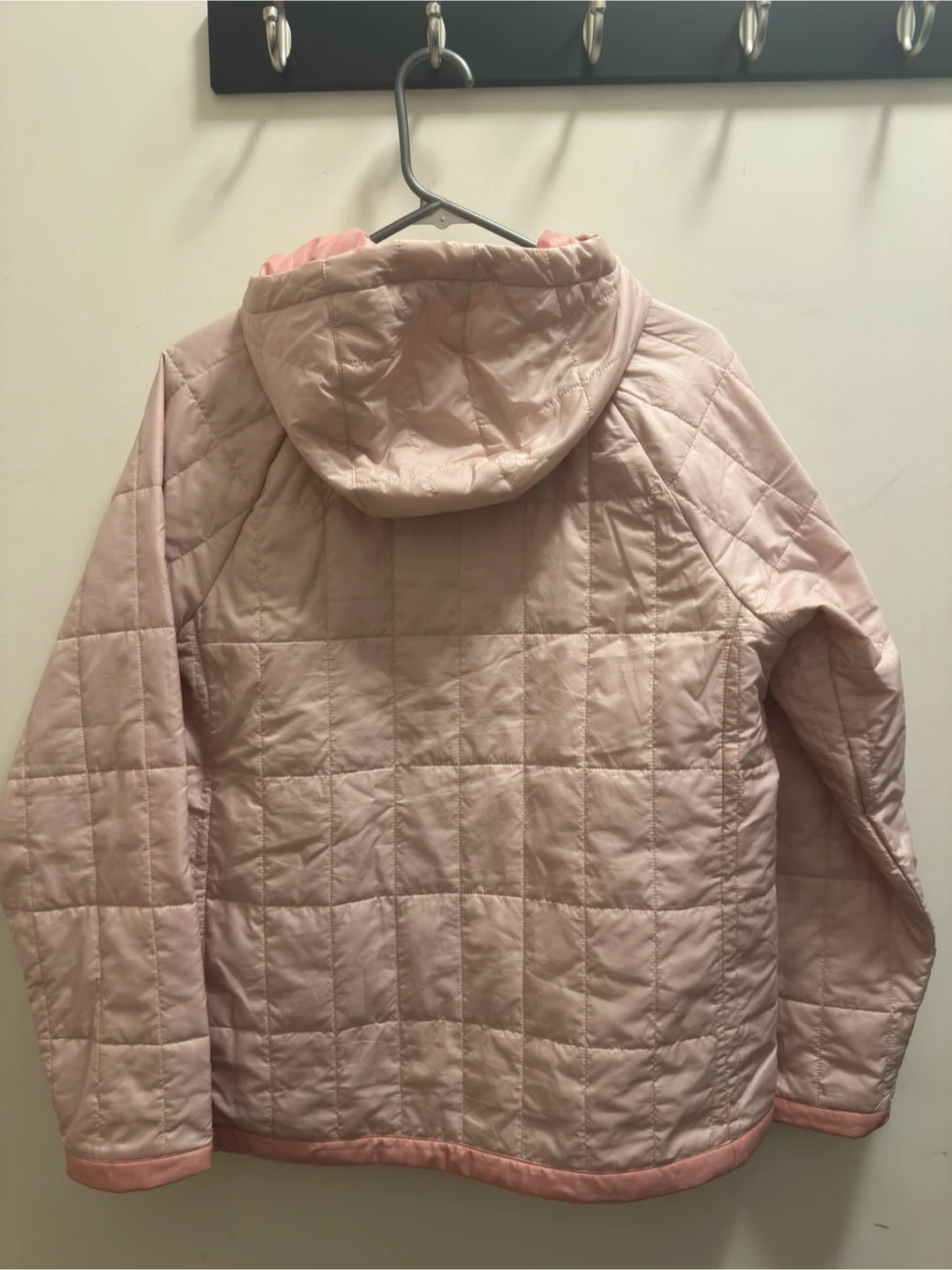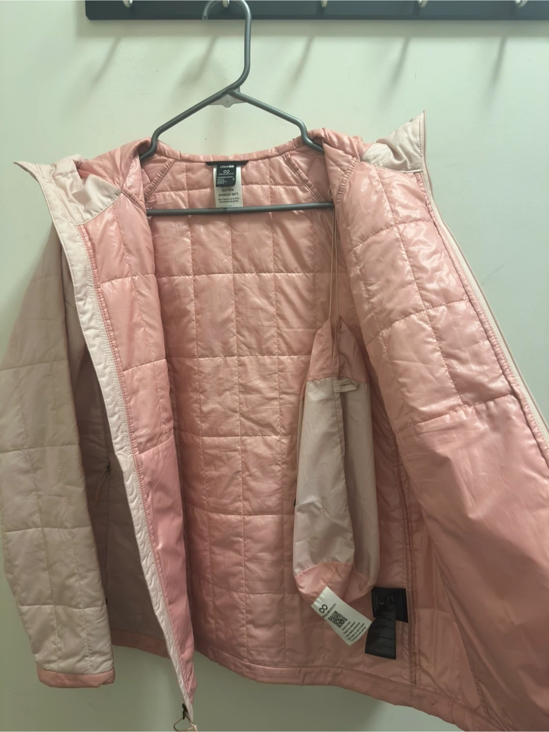 Pink quilted hoodie jacket. It's a packable design with a full zip closure and a hood. This jacket's light and warm, perfect for layering and spring weather. Slim fit