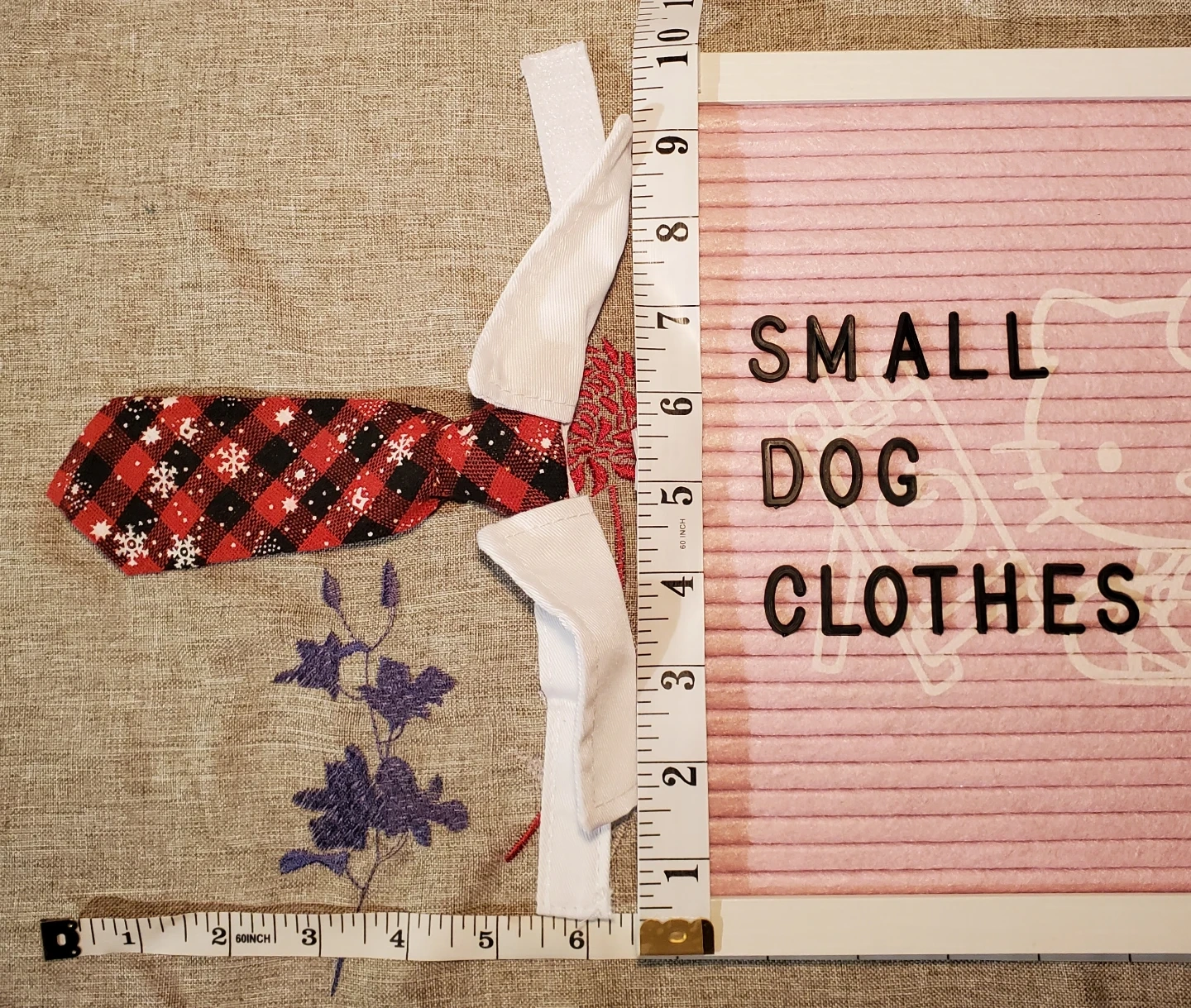 Holiday-themed red and black plaid tie with snowflake accents for small dogs. Features a white collar and adjustable neck strap.