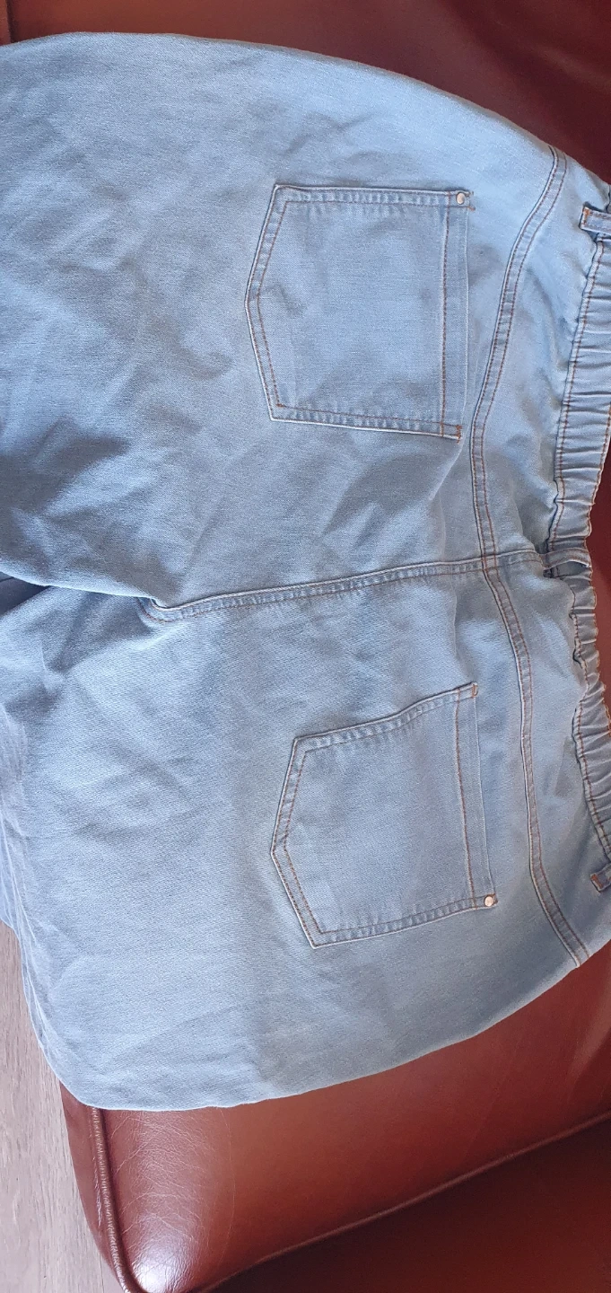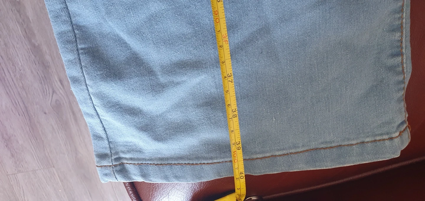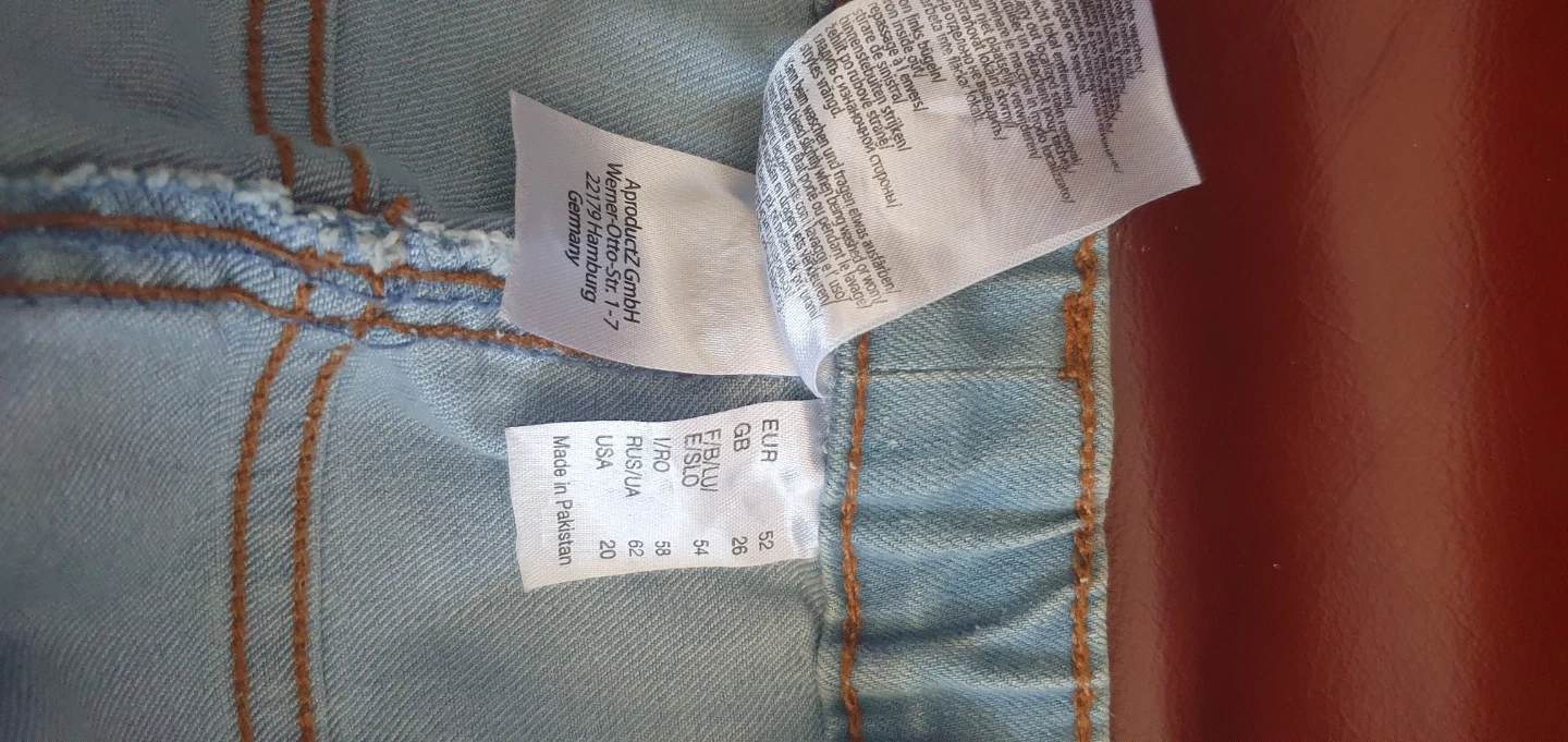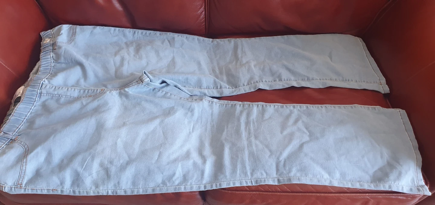 Light wash denim jeans with an elastic waistband. Made in Pakistan. Size L fits a EUR 52, USA 20, and RUS/UA 62.