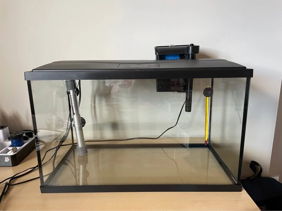 Less than a year old. Moving away and can’t take the tank with me 😢. Lights, heater and filter works! I have an extra filter, more than half a container of food for tropical fish, brand new black net (never been used) and a variety of plants and decor, including 2 bags worth of pebbles that fill the 10 gallon tank.