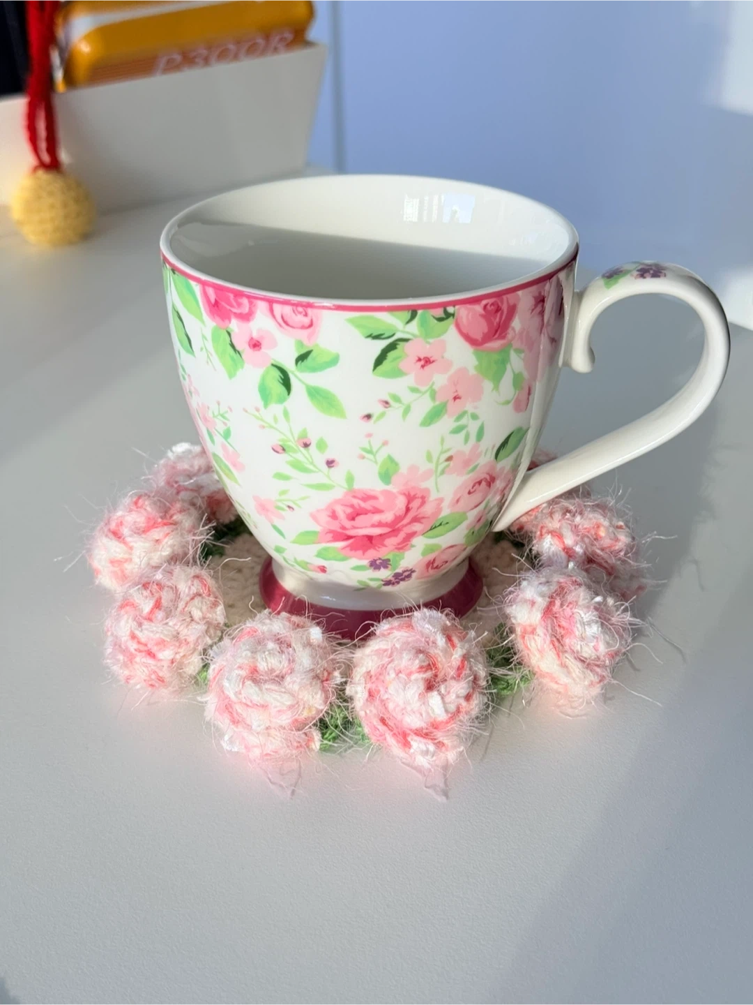 Check out this cute handmade crochet coaster set! It features a lovely design with roses.