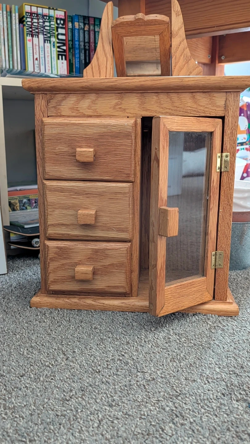 This is a lovely wooden jewelry box with three drawers and a glass-fronted compartment. It also features a small mirror on top.